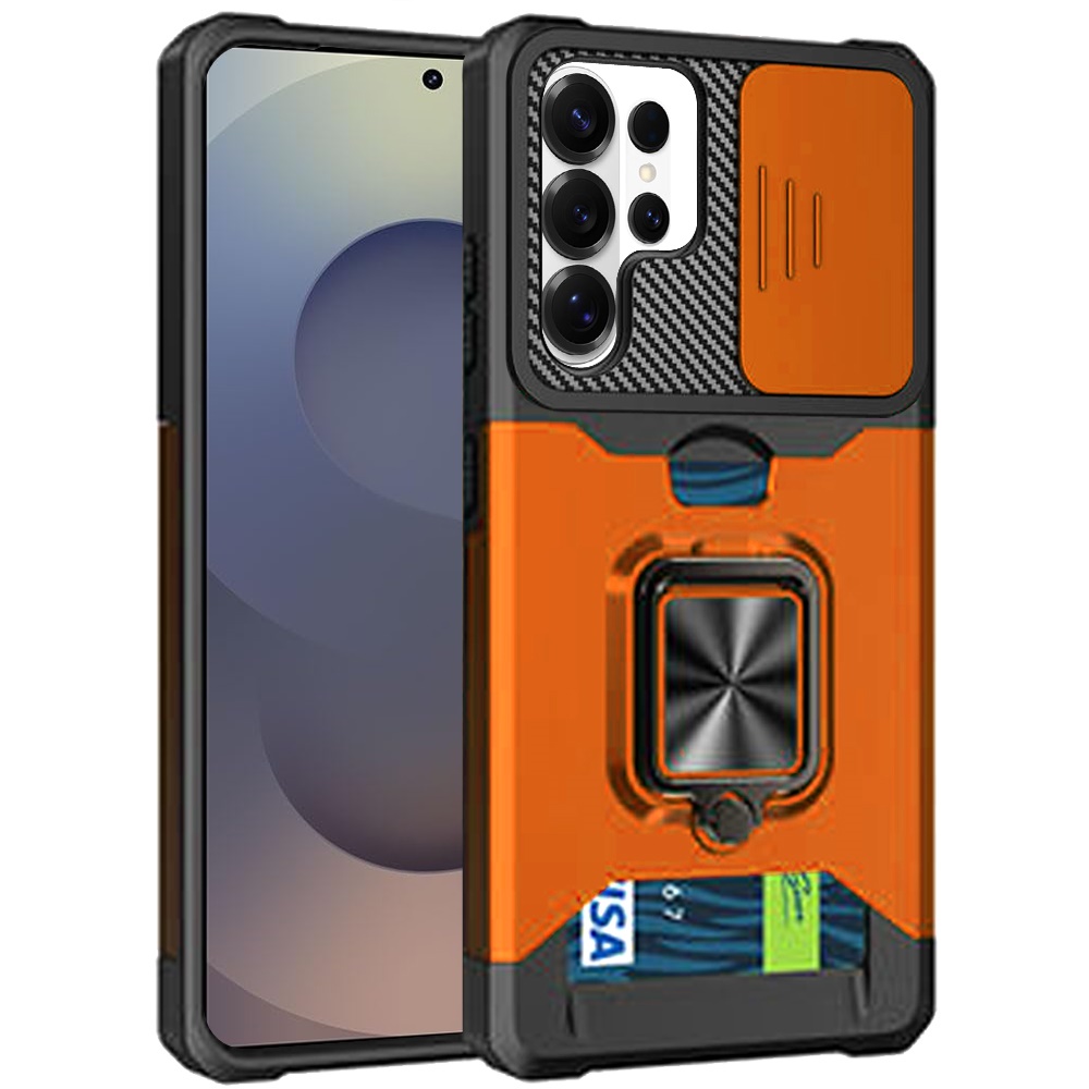 For Samsung s25 Ultra Multi-Functional Card Magnetic Ring Stand Hybrid Camera Case Cover - Cosmic Orange