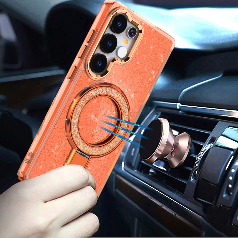 For Samsung s26 Ultra Transparent Glitter Rotaional Magnetic Ring Stand HQ Hybrid - Cosmic Orange