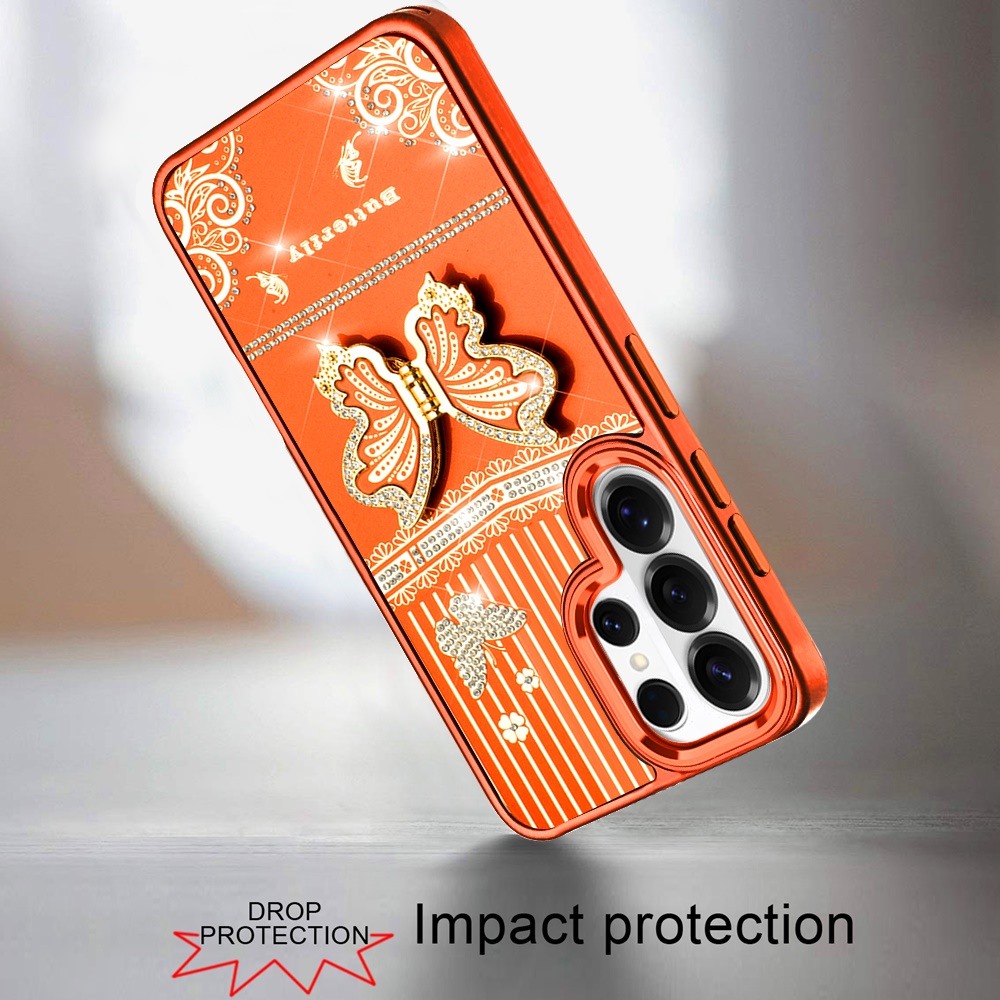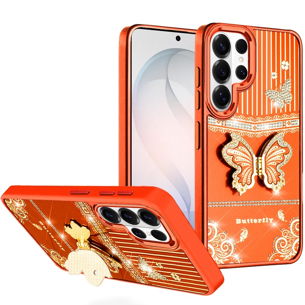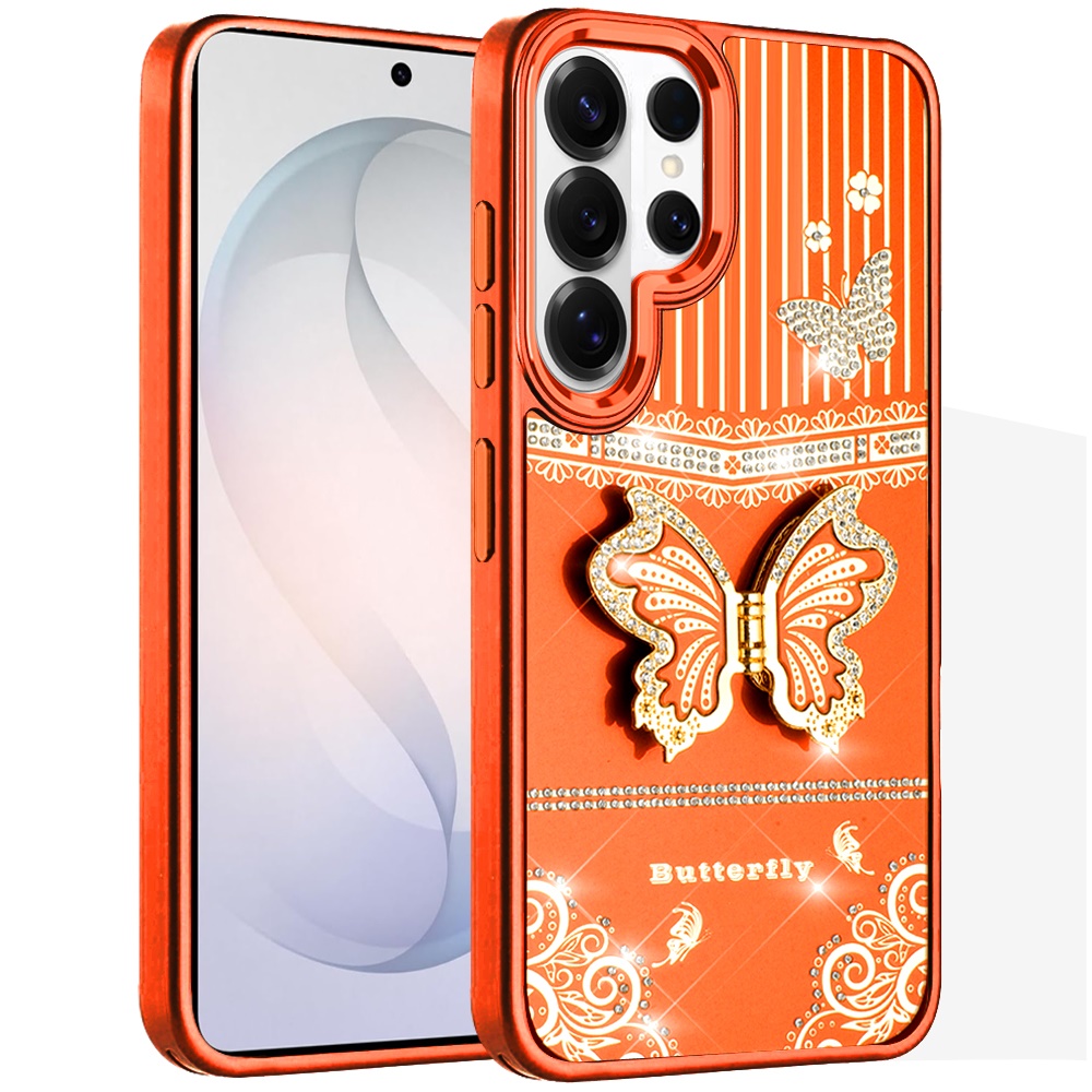 For Samsung s26 Ultra Splendid Glitter Butterfly Design Stand with Metallic Edges Hybrid Case - Cosmic Orange