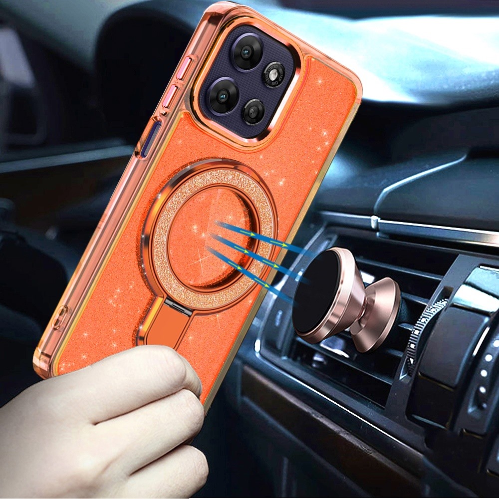 For Motorola Moto G Power 5G 2025 Transparent Glitter Rotaional Magnetic Ring Stand HQ Hybrid - Cosmic Orange