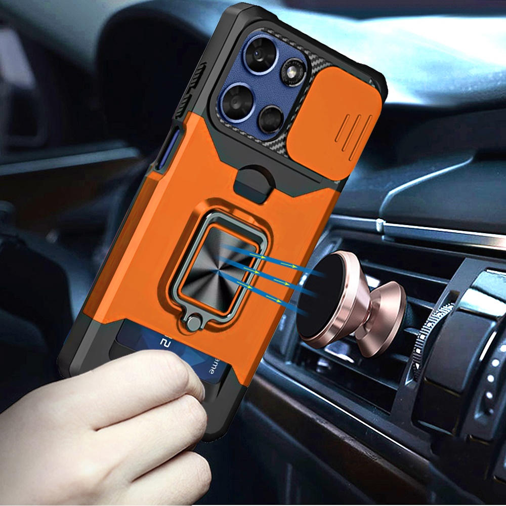 For Moto G Stylus 5G 2025 Multi-Functional Card Magnetic Ring Stand Hybrid Camera Case Cover - Cosmic Orange