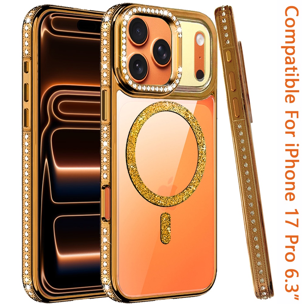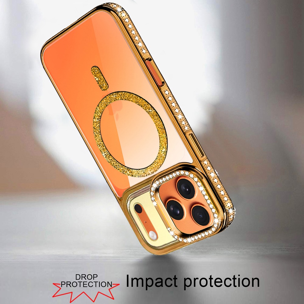 For iPhone 17 Pro Luxury Diamond Edged Magnetic Glitter Circle Hybrid with Camera Stand - Gold