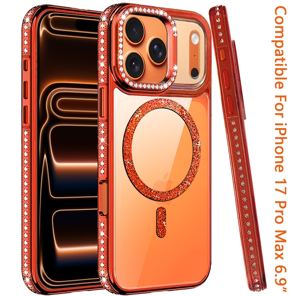For iPhone 17 Pro Max Luxury Diamond Edged Magnetic Glitter Circle Hybrid with Camera Stand - Orange