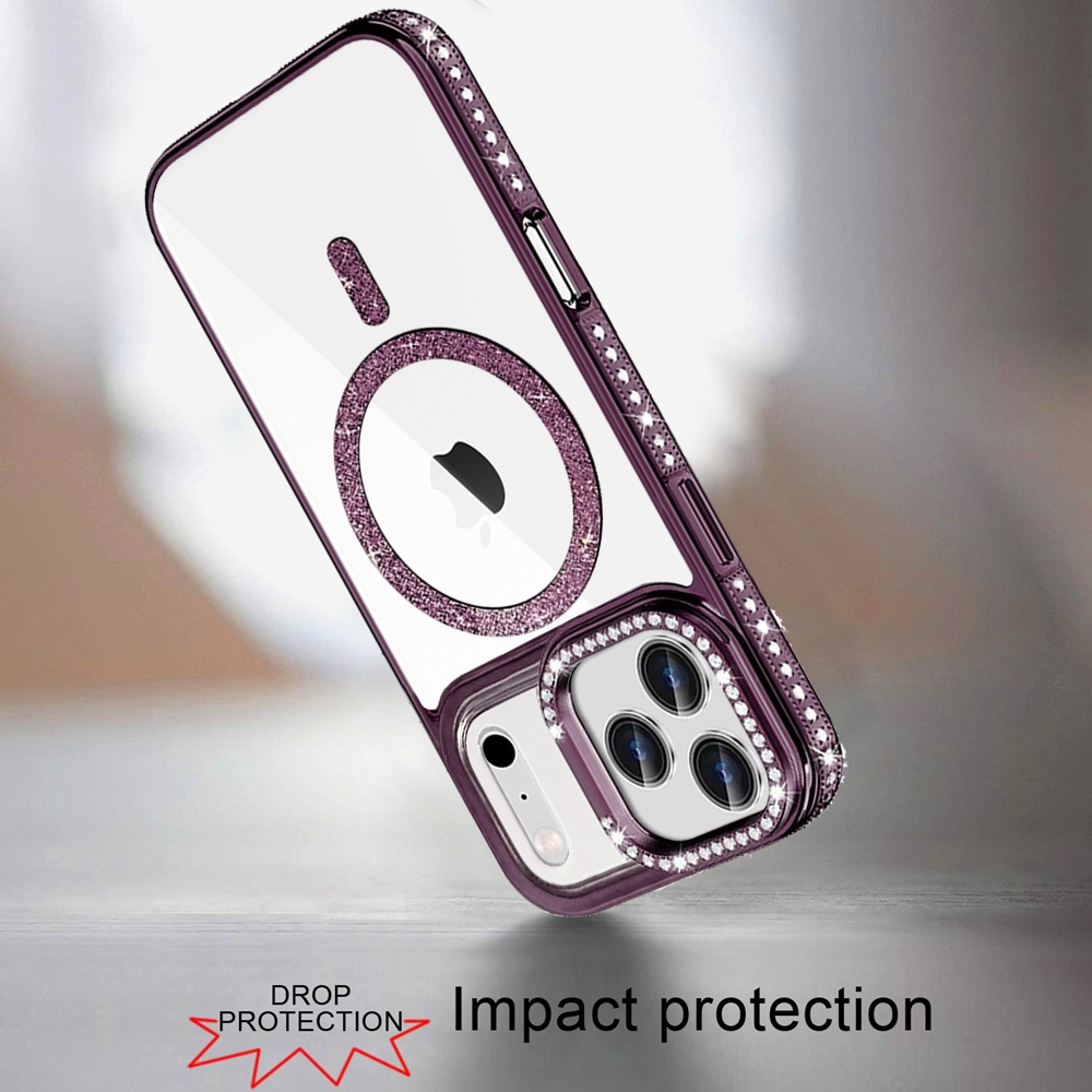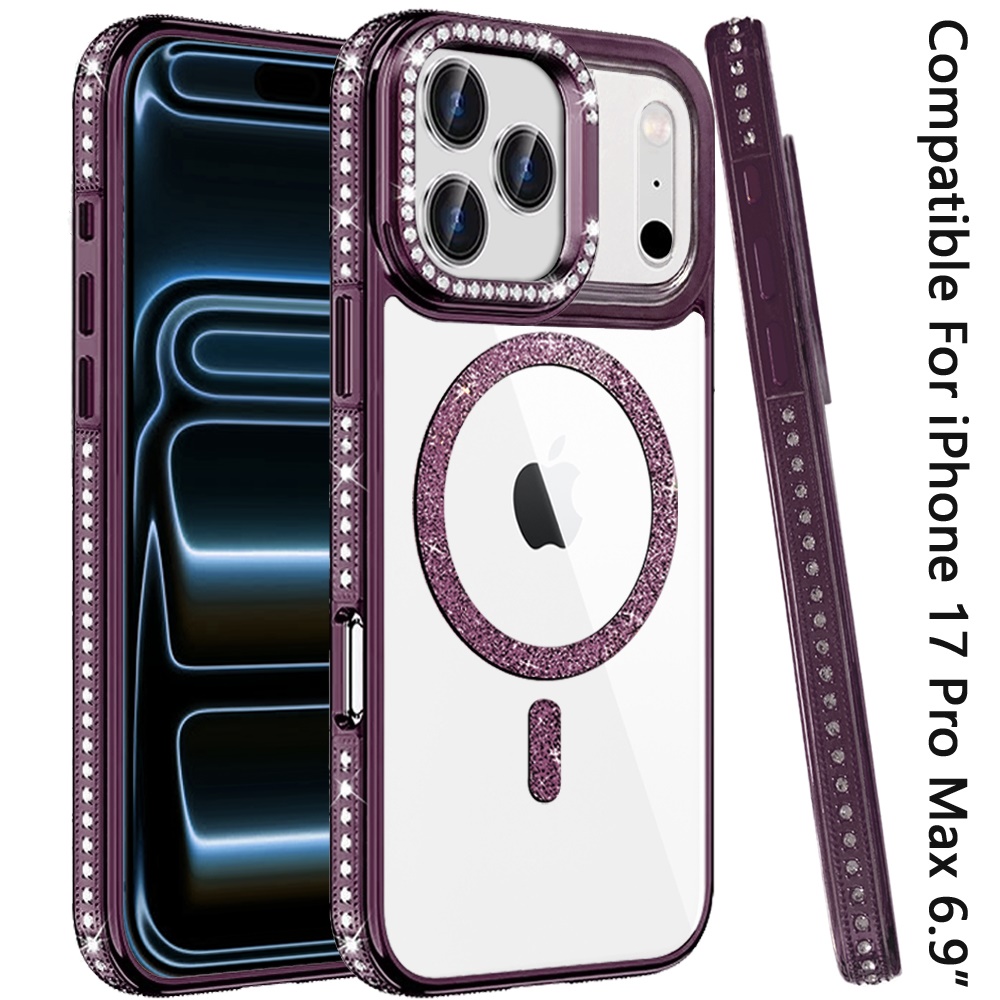 For iPhone 17 Pro Max Luxury Diamond Edged Magnetic Glitter Circle Hybrid with Camera Stand - Dark Purple