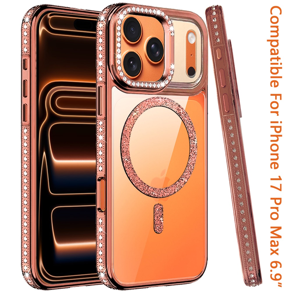 For iPhone 17 Pro Max Luxury Diamond Edged Magnetic Glitter Circle Hybrid with Camera Stand - Rose Gold