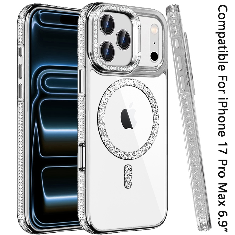 For iPhone 17 Pro Max Luxury Diamond Edged Magnetic Glitter Circle Hybrid with Camera Stand - Silver