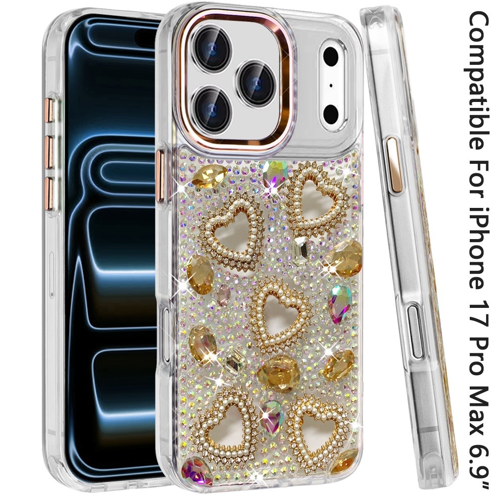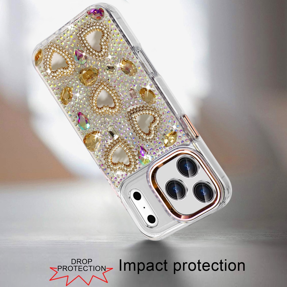 For iPhone 17 Pro Max Luxury Crystal Heart Rhinestones Diamond Bling Hybrid Case - Gold