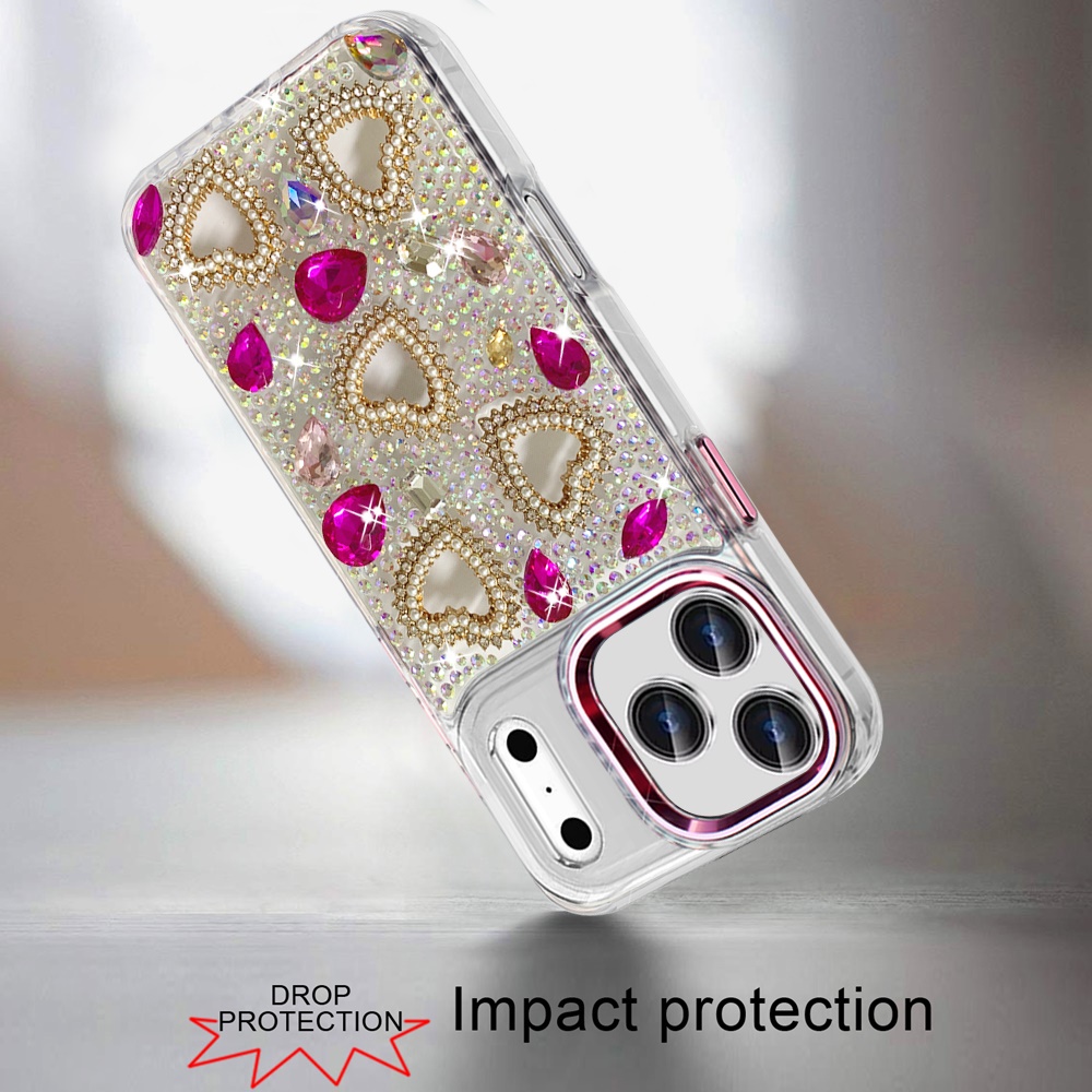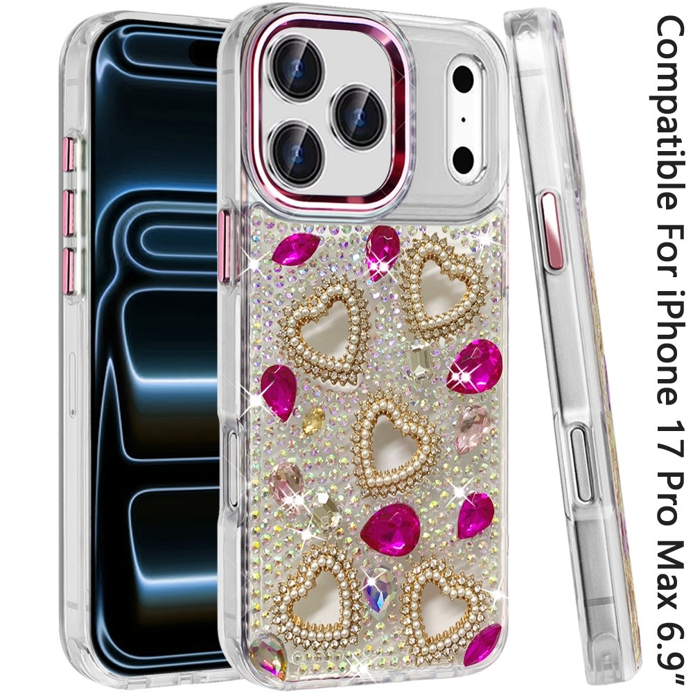 For iPhone 17 Pro Max Luxury Crystal Heart Rhinestones Diamond Bling Hybrid Case - Hot Pink