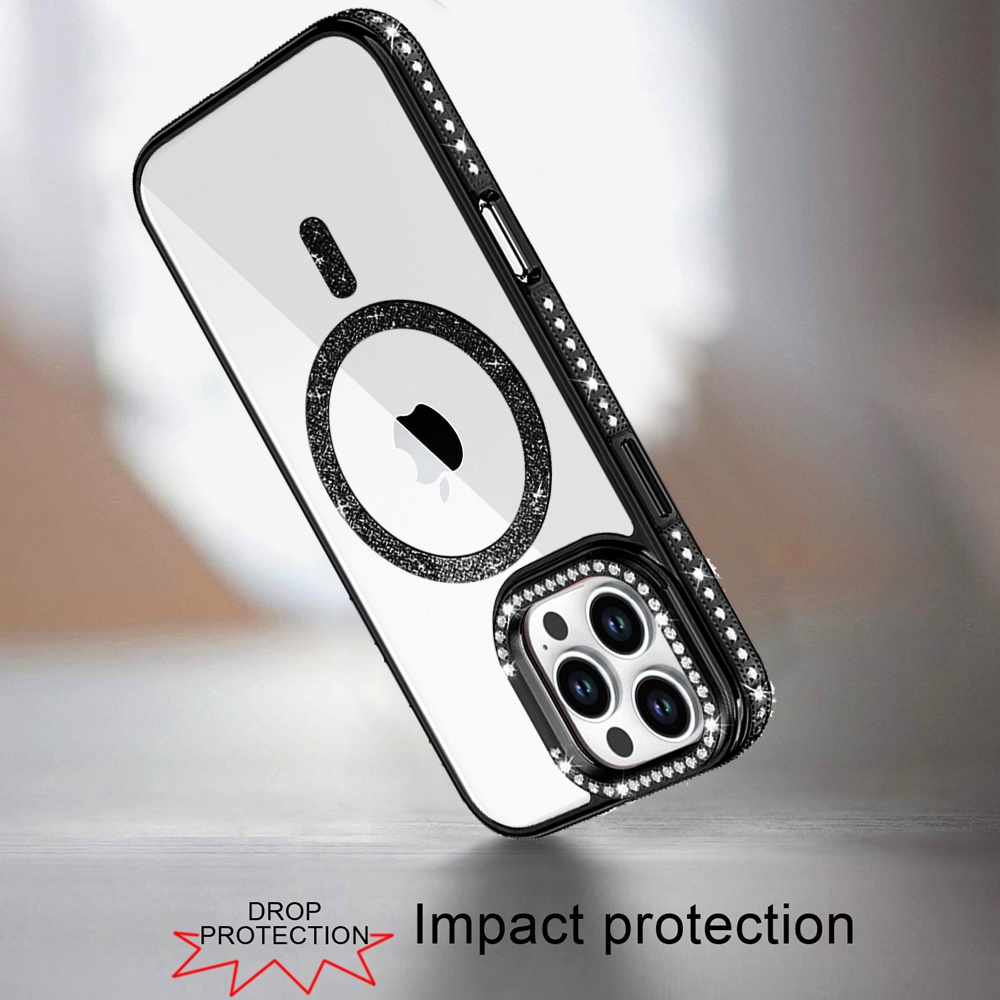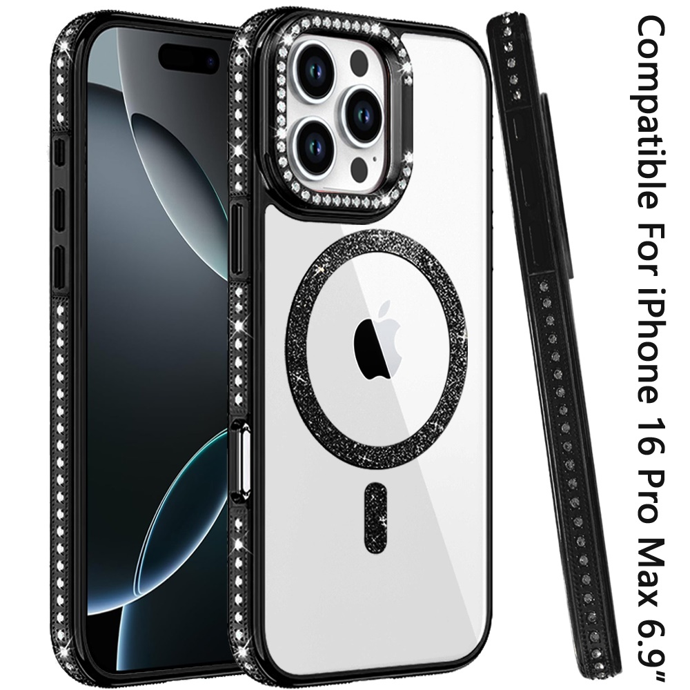 For iPhone 16 Pro Max 6.9 Luxury Diamond Edged Magnetic Glitter Circle Hybrid with Camera Stand - Black