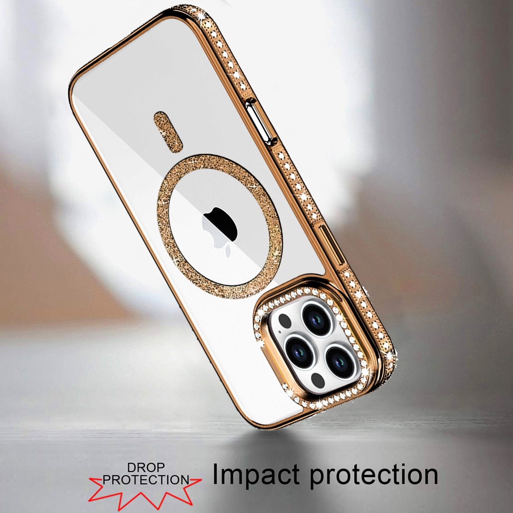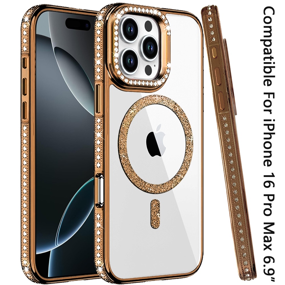 For iPhone 16 Pro Max 6.9 Luxury Diamond Edged Magnetic Glitter Circle Hybrid with Camera Stand - Gold