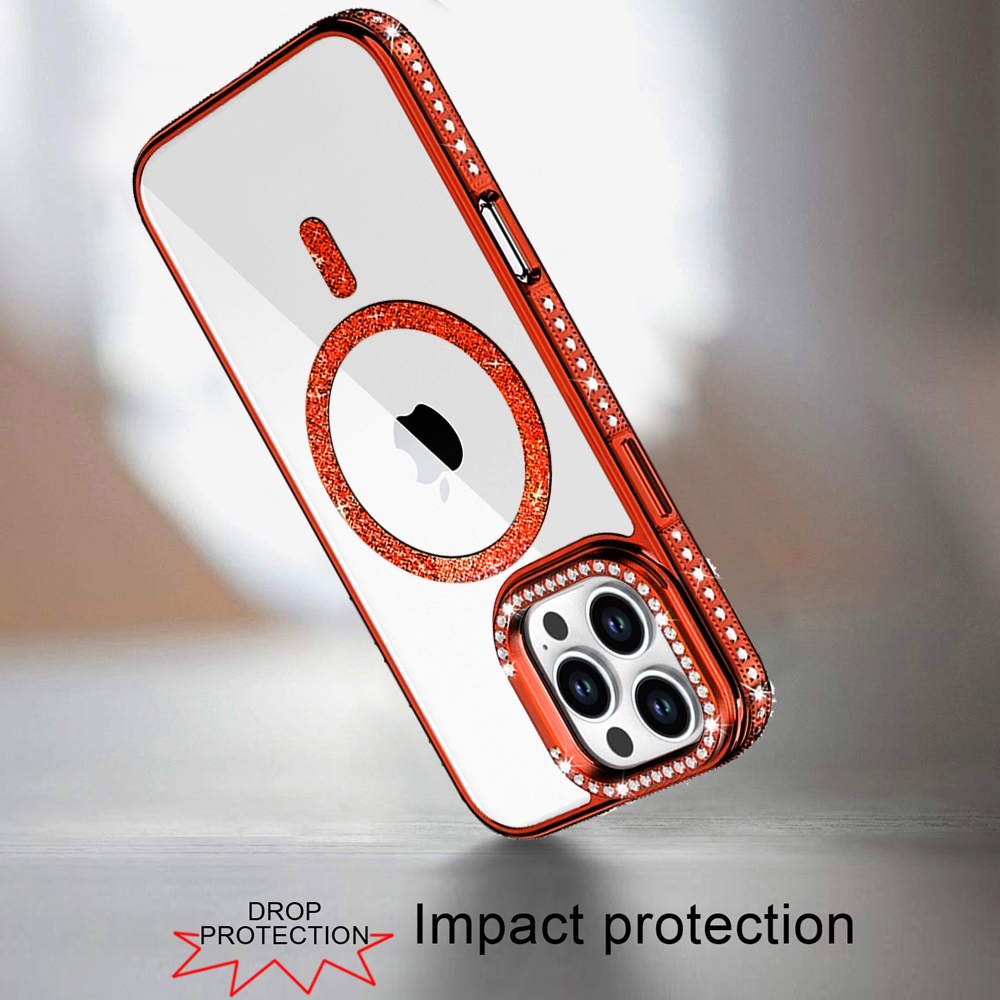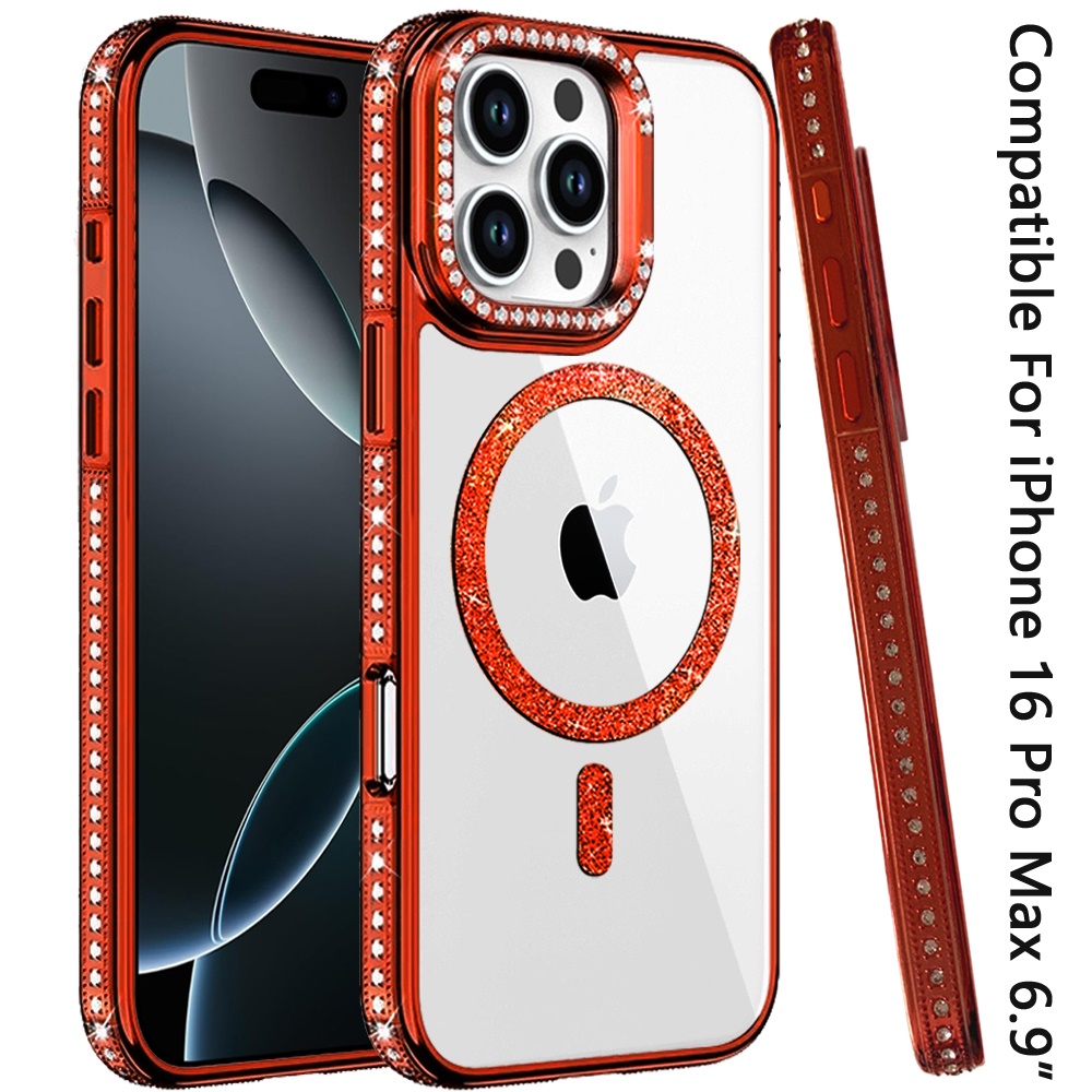 For iPhone 16 Pro Max 6.9 Luxury Diamond Edged Magnetic Glitter Circle Hybrid with Camera Stand - Orange