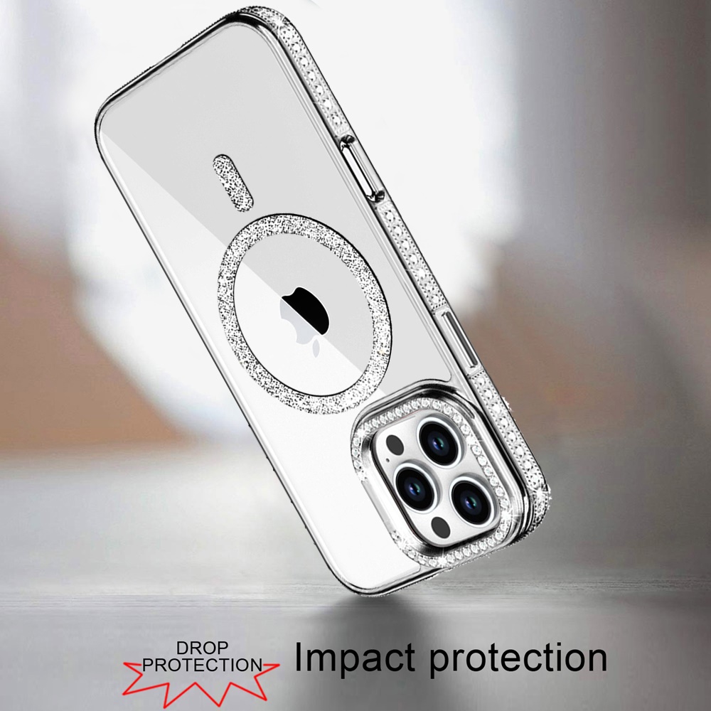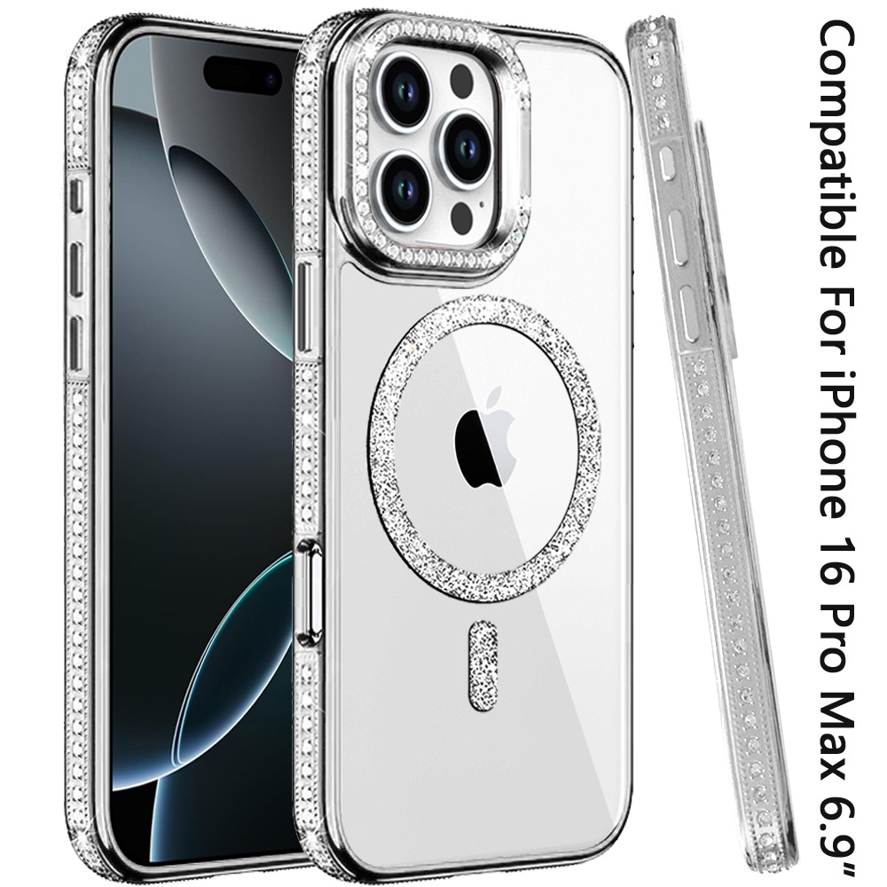 For iPhone 16 Pro Max 6.9 Luxury Diamond Edged Magnetic Glitter Circle Hybrid with Camera Stand - Silver