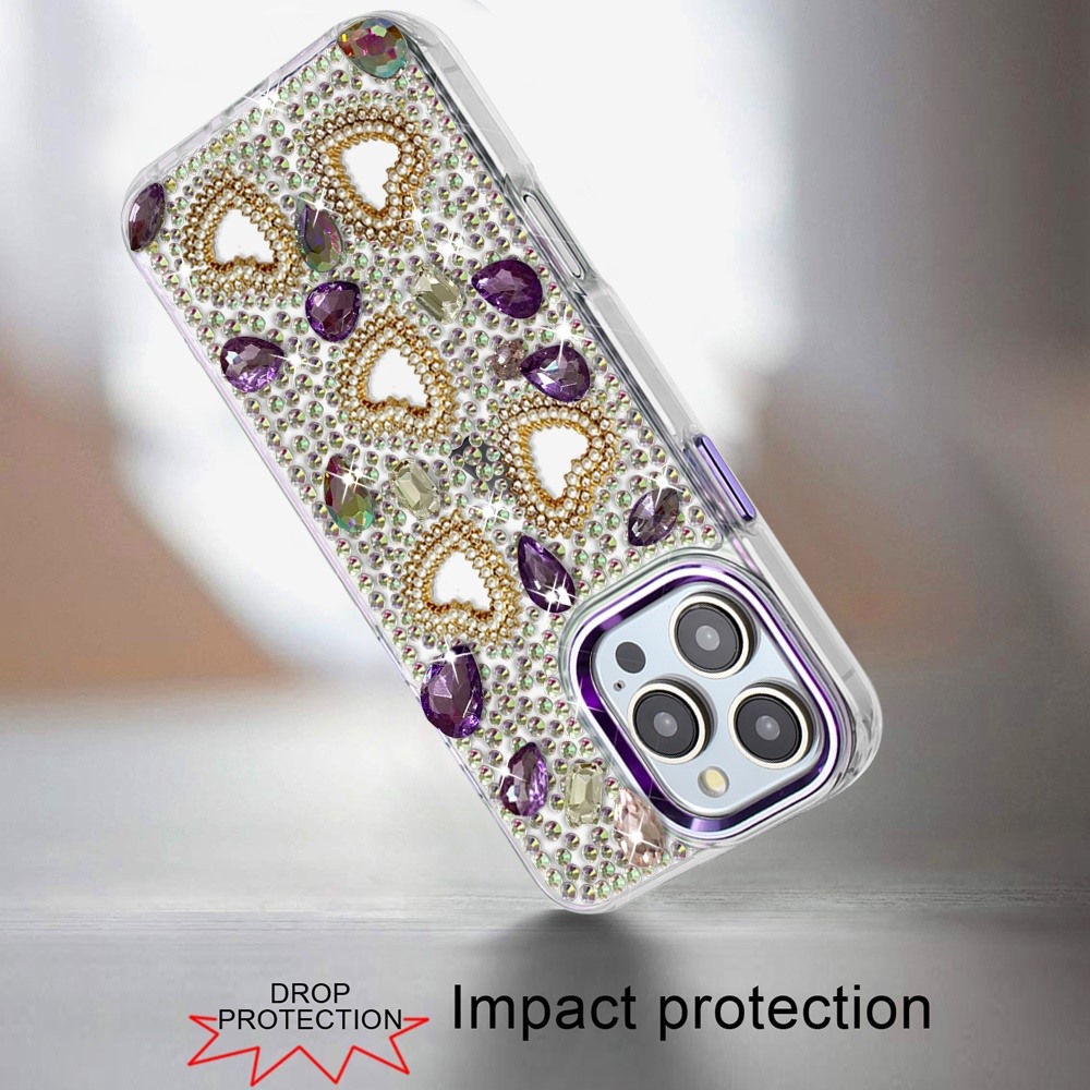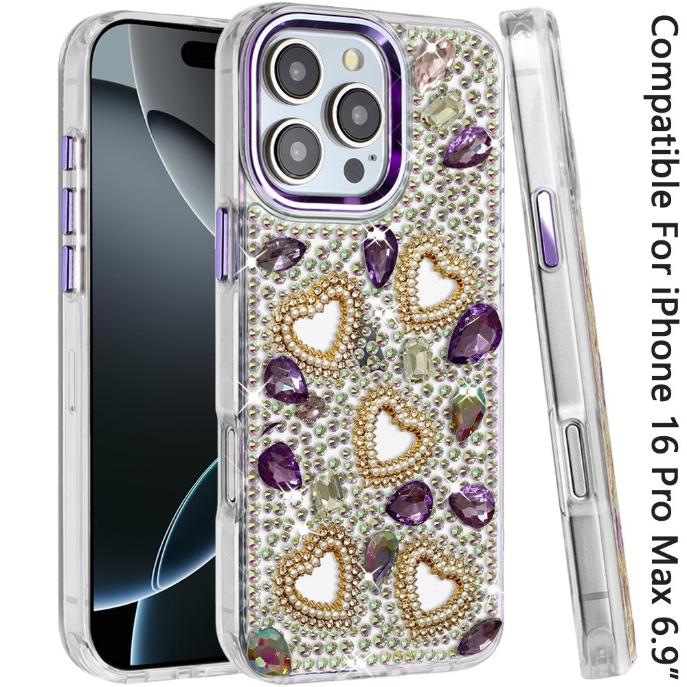 For iPhone 16 Pro Max 6.9 Luxury Crystal Heart Rhinestones Diamond Bling Hybrid Case - Dark Purple
