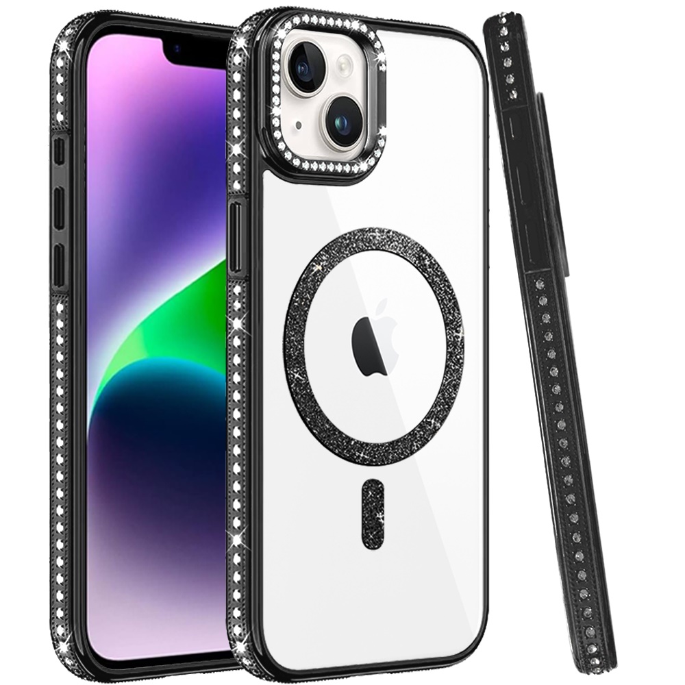 For iPhone 13/14 Luxury Diamond Edged Magnetic Glitter Circle Hybrid with Camera Stand - Black