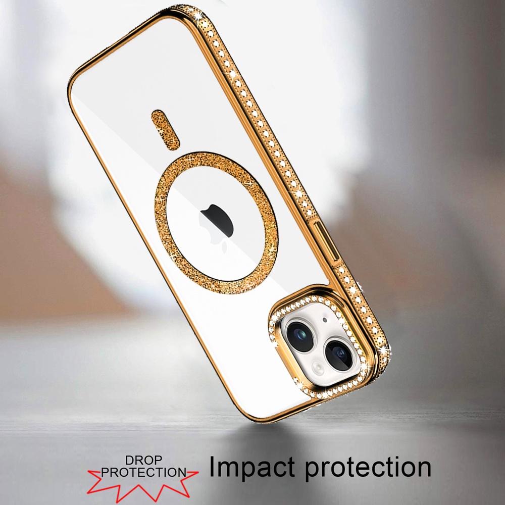For iPhone 13/14 Luxury Diamond Edged Magnetic Glitter Circle Hybrid with Camera Stand - Gold
