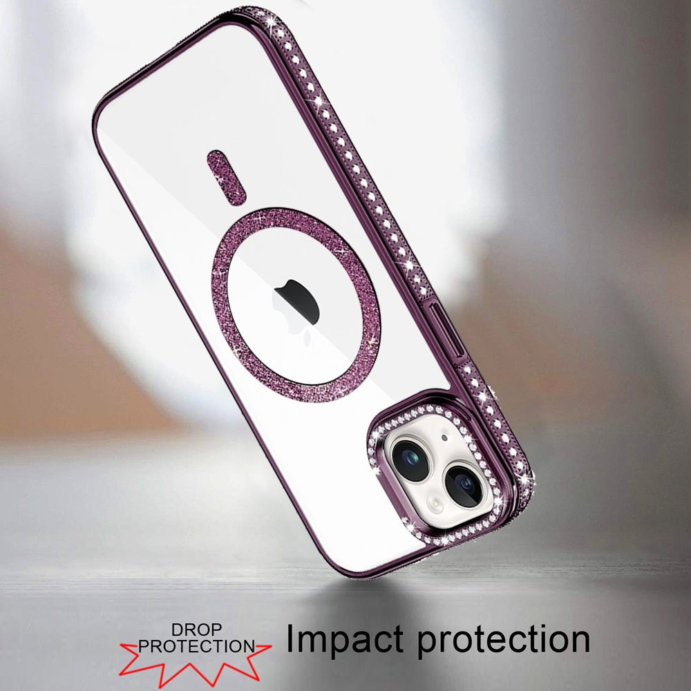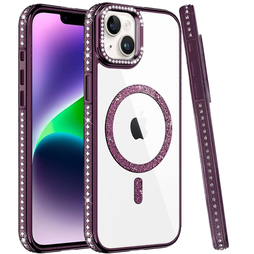For iPhone 13/14 Luxury Diamond Edged Magnetic Glitter Circle Hybrid with Camera Stand - Dark Purple
