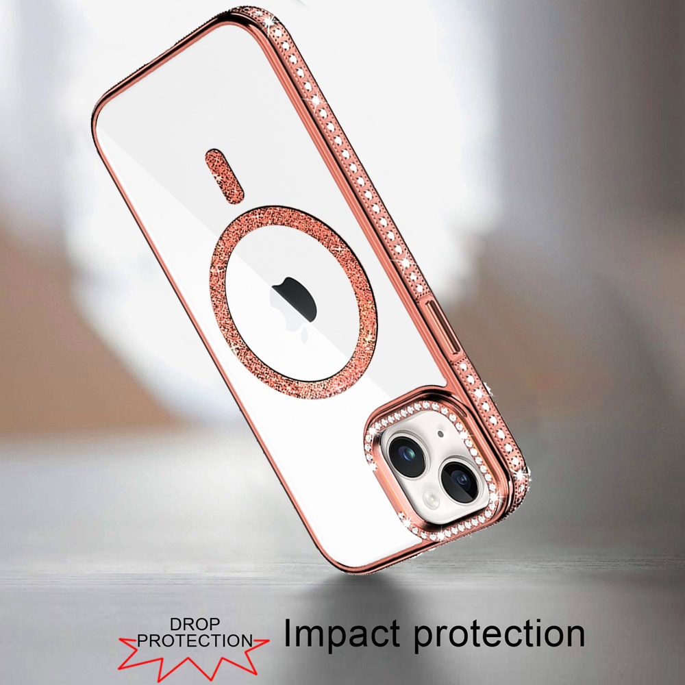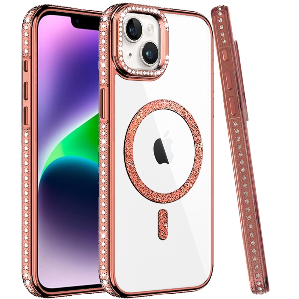 For iPhone 13/14 Luxury Diamond Edged Magnetic Glitter Circle Hybrid with Camera Stand - Rose Gold