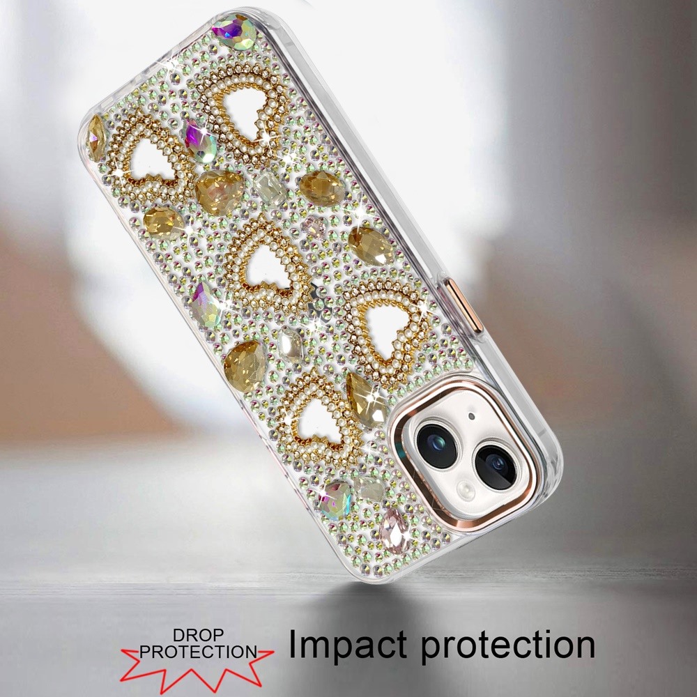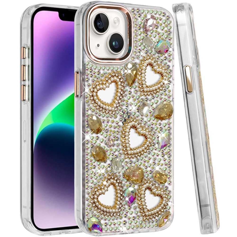For iPhone 13/14 Luxury Crystal Heart Rhinestones Diamond Bling Hybrid Case - Gold