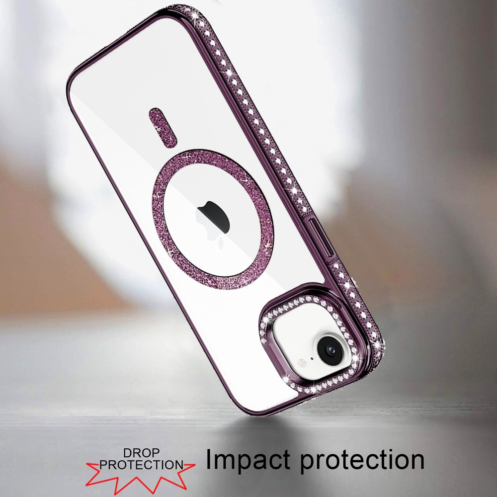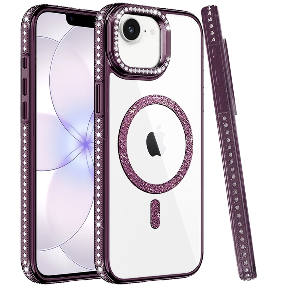 For iPhone 16E (E edition) / SE4 (2025) Luxury Diamond Edged Magnetic Glitter Circle Hybrid with Camera Stand - Dark Purple