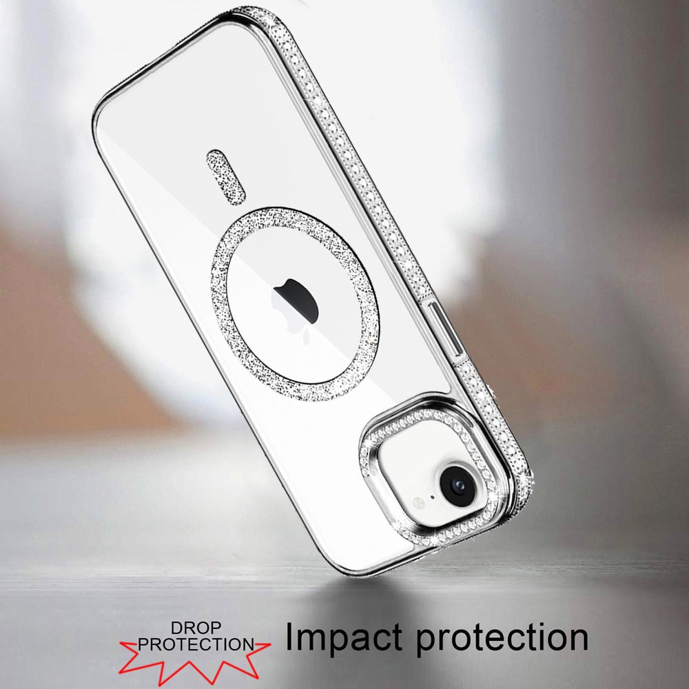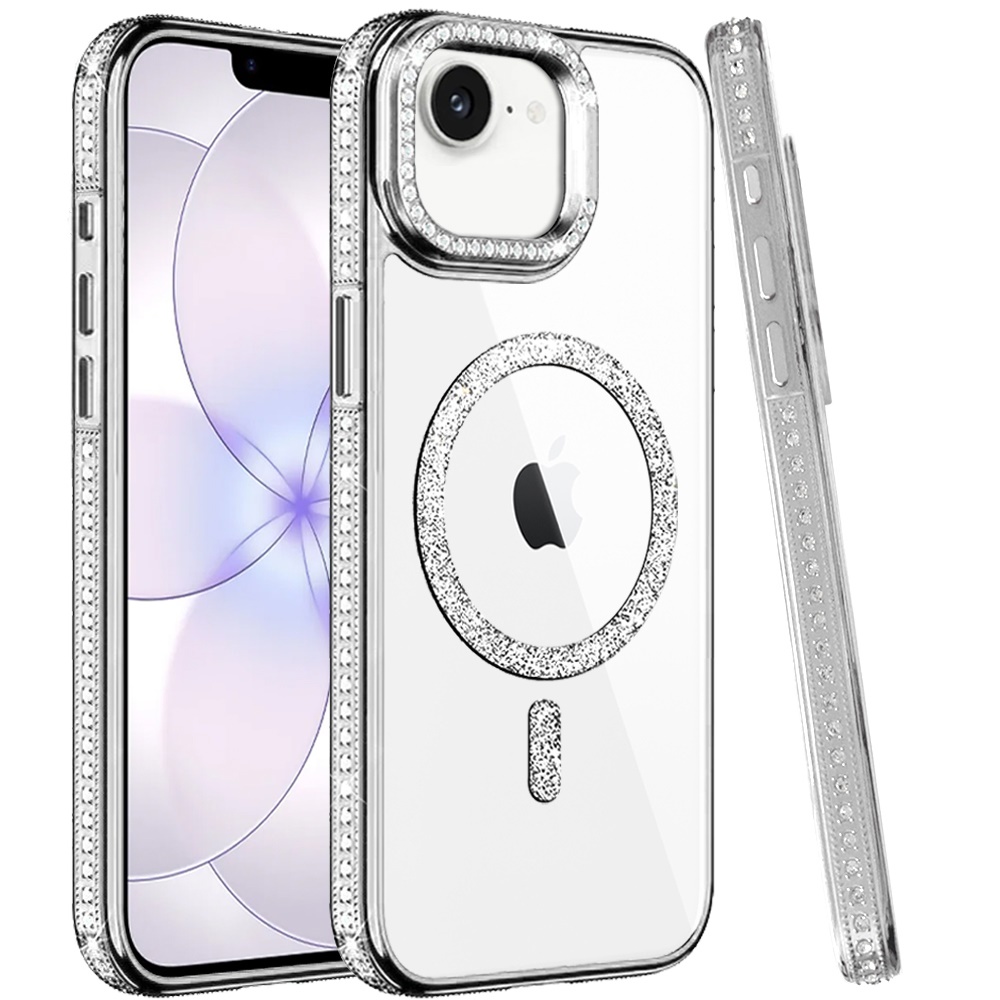 For iPhone 16E (E edition) / SE4 (2025) Luxury Diamond Edged Magnetic Glitter Circle Hybrid with Camera Stand - Silver