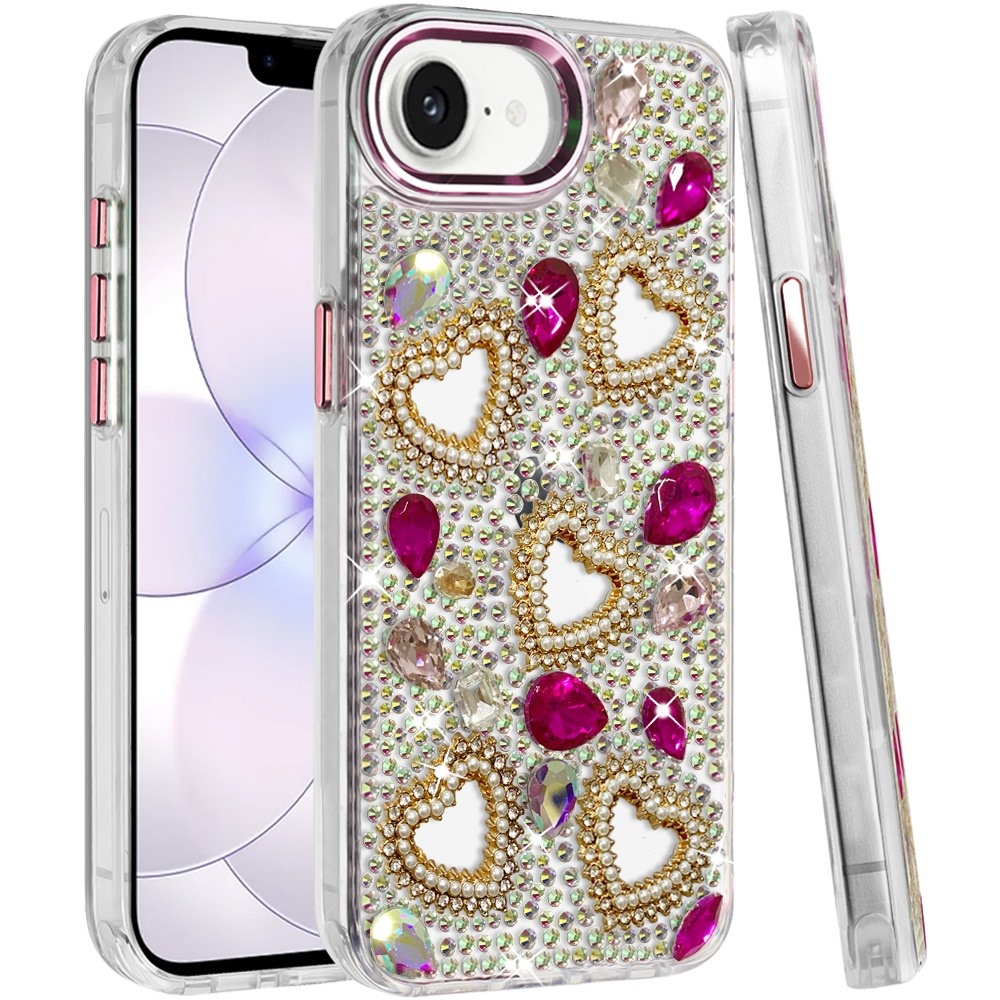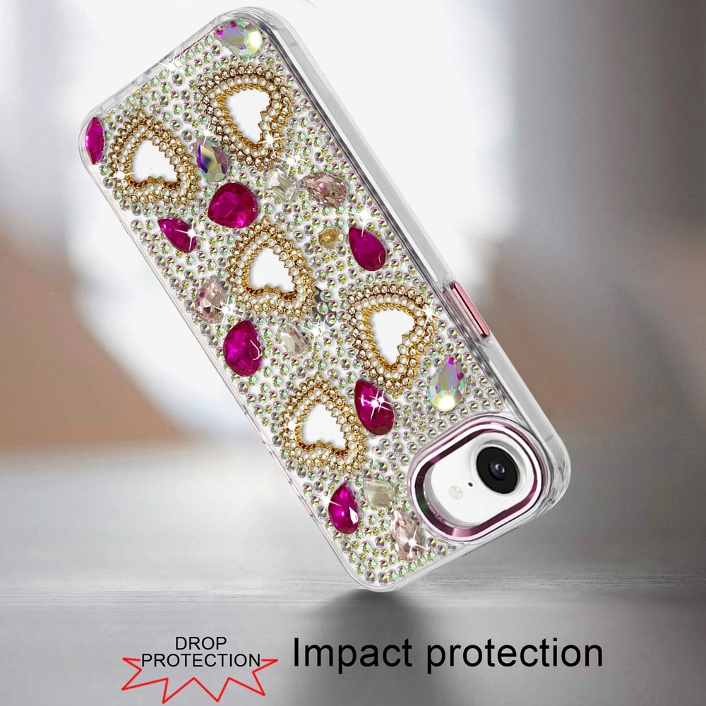 For iPhone 16E (E edition) / SE4 (2025) Luxury Crystal Heart Rhinestones Diamond Bling Hybrid Case - Hot Pink