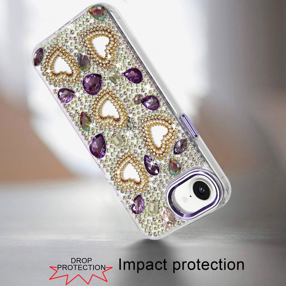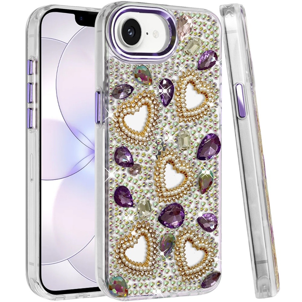 For iPhone 16E (E edition) / SE4 (2025) Luxury Crystal Heart Rhinestones Diamond Bling Hybrid Case - Dark Purple