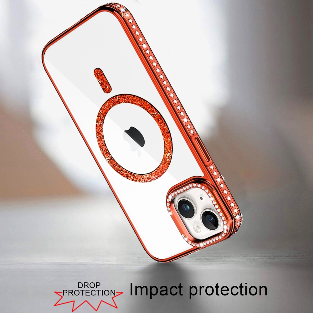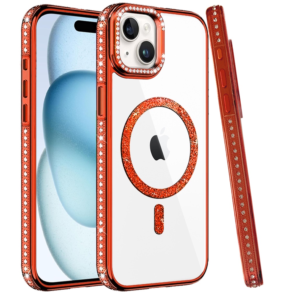 For iPhone 15 Luxury Diamond Edged Magnetic Glitter Circle Hybrid with Camera Stand - Orange