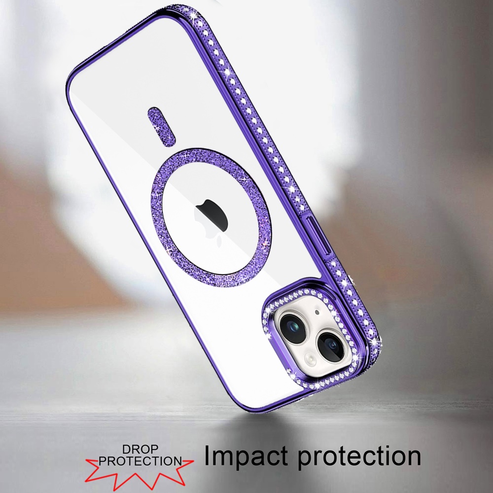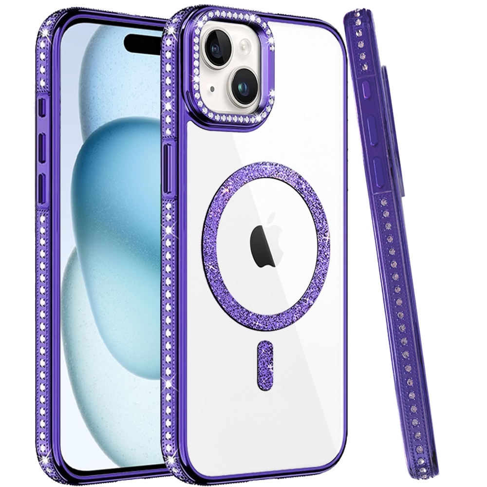 For iPhone 15 Luxury Diamond Edged Magnetic Glitter Circle Hybrid with Camera Stand - Dark Purple