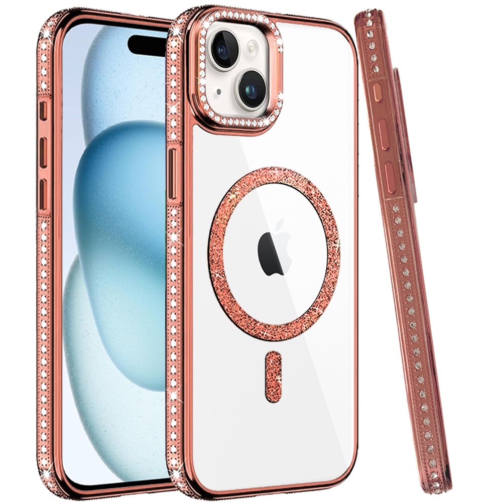 For iPhone 15 Luxury Diamond Edged Magnetic Glitter Circle Hybrid with Camera Stand - Rose Gold