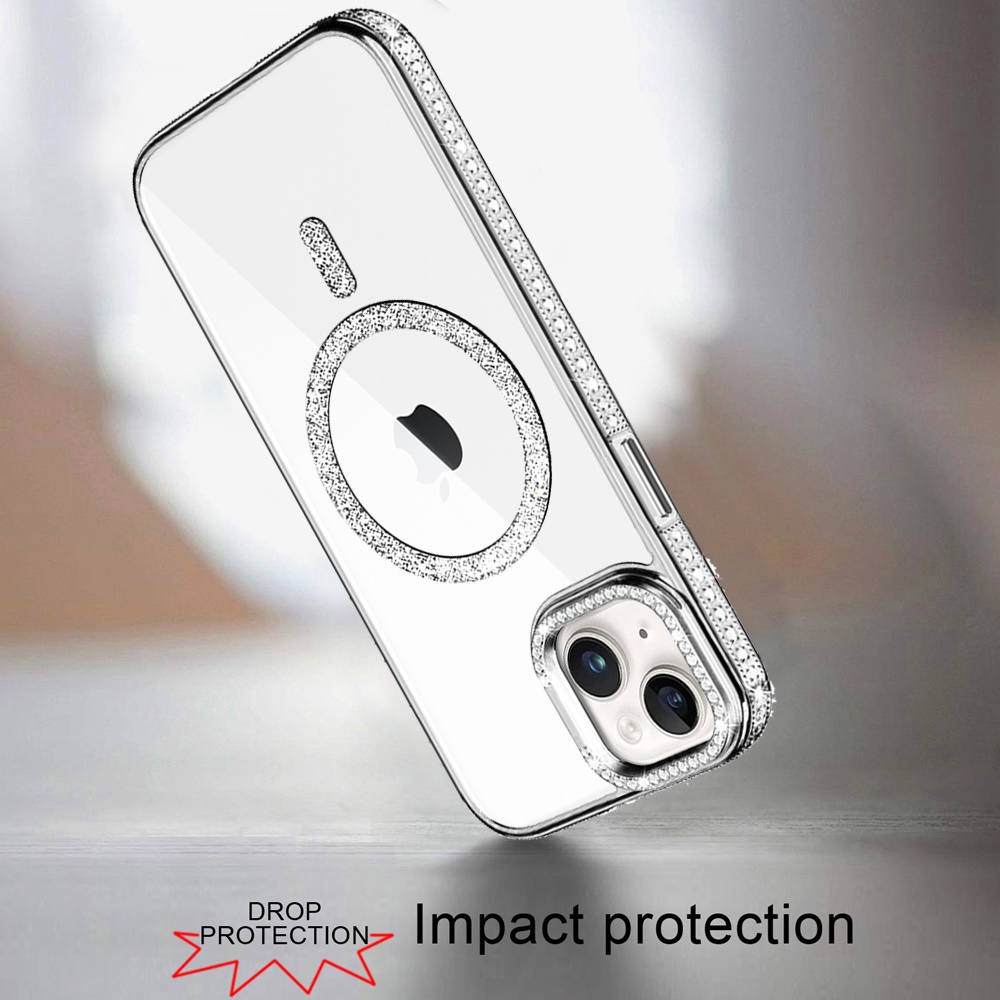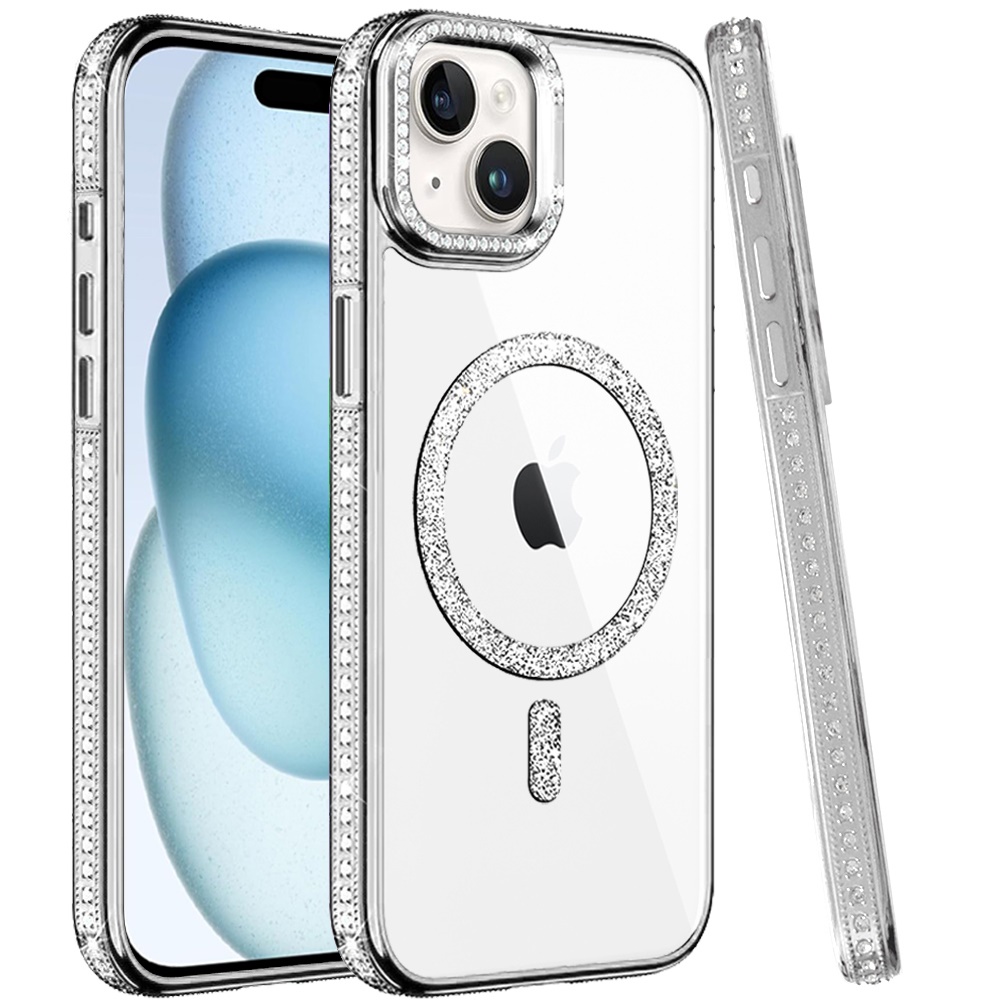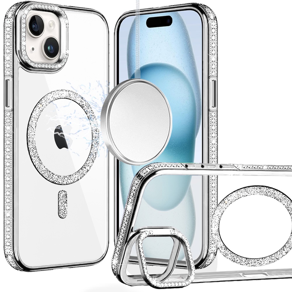 For iPhone 15 Luxury Diamond Edged Magnetic Glitter Circle Hybrid with Camera Stand - Silver
