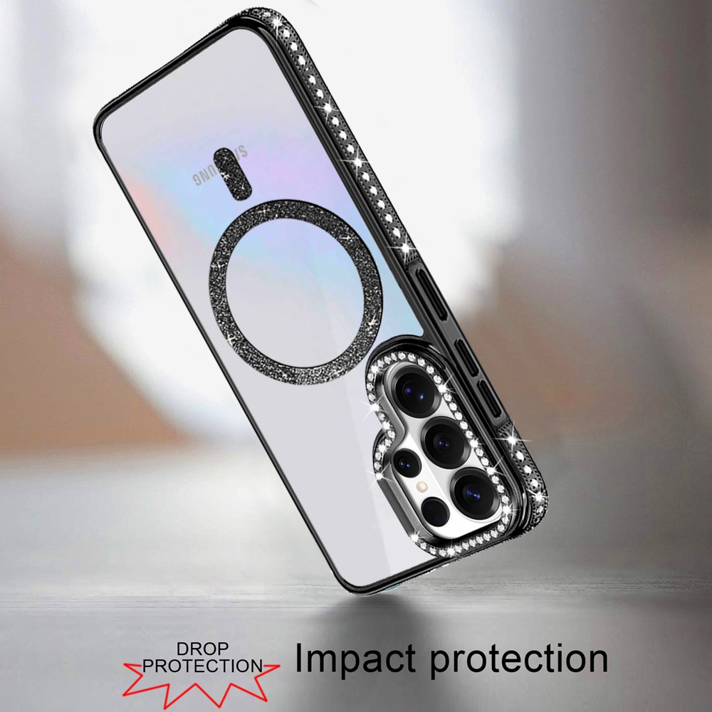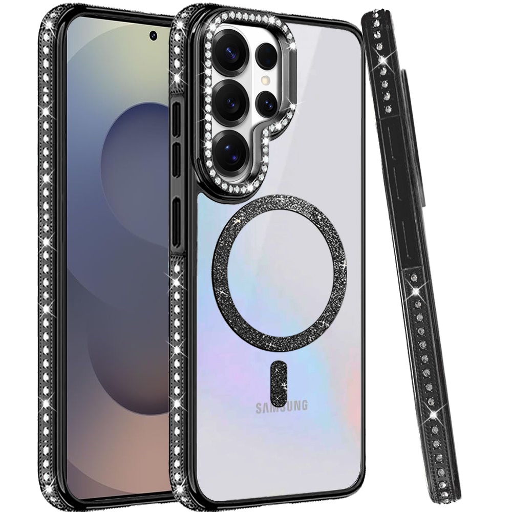 For Samsung s25 Ultra Luxury Diamond Edged Magnetic Glitter Circle Hybrid with Camera Stand - Black