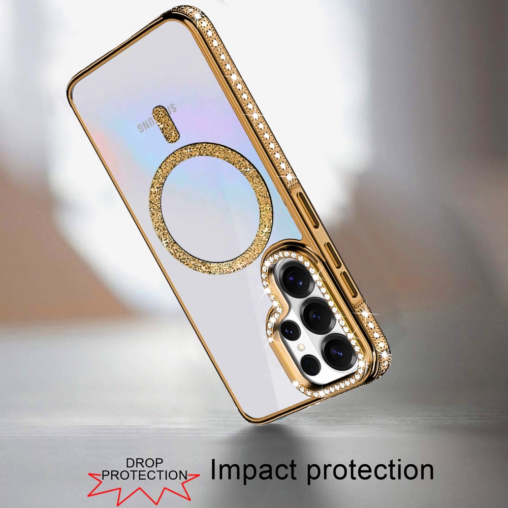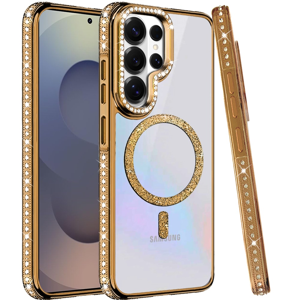 For Samsung s25 Ultra Luxury Diamond Edged Magnetic Glitter Circle Hybrid with Camera Stand - Gold