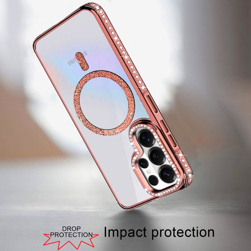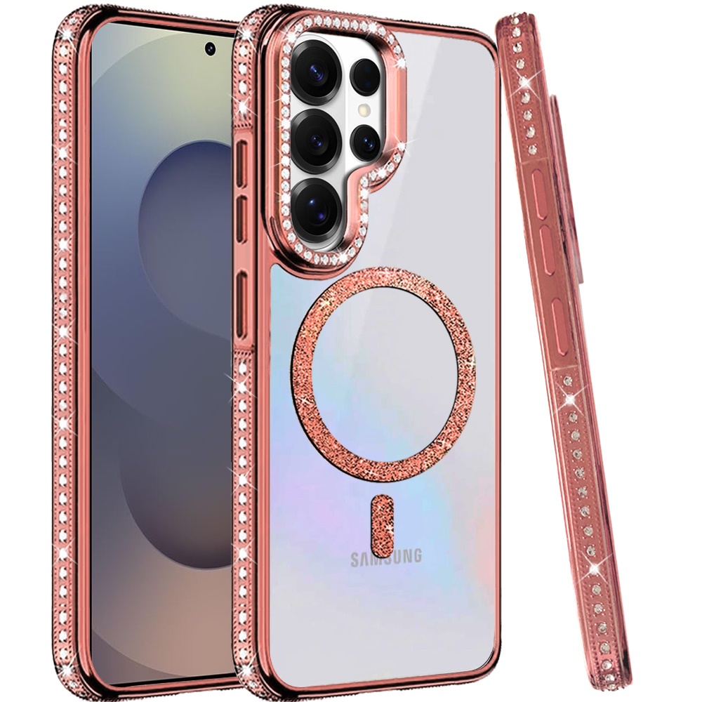 For Samsung s25 Ultra Luxury Diamond Edged Magnetic Glitter Circle Hybrid with Camera Stand - Rose Gold