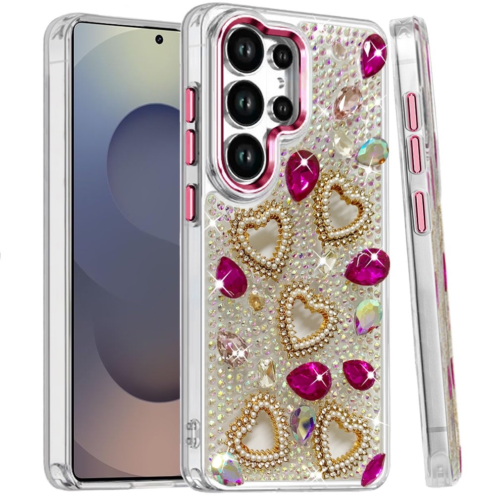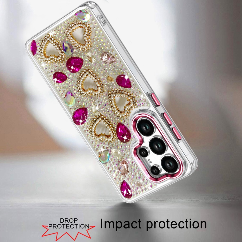 For Samsung s25 Ultra Luxury Crystal Heart Rhinestones Diamond Bling Hybrid Case - Hot Pink