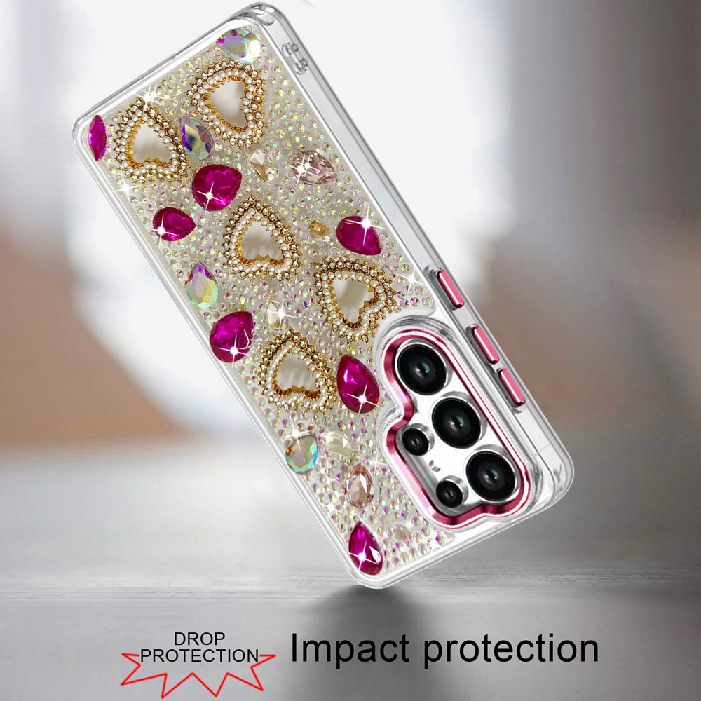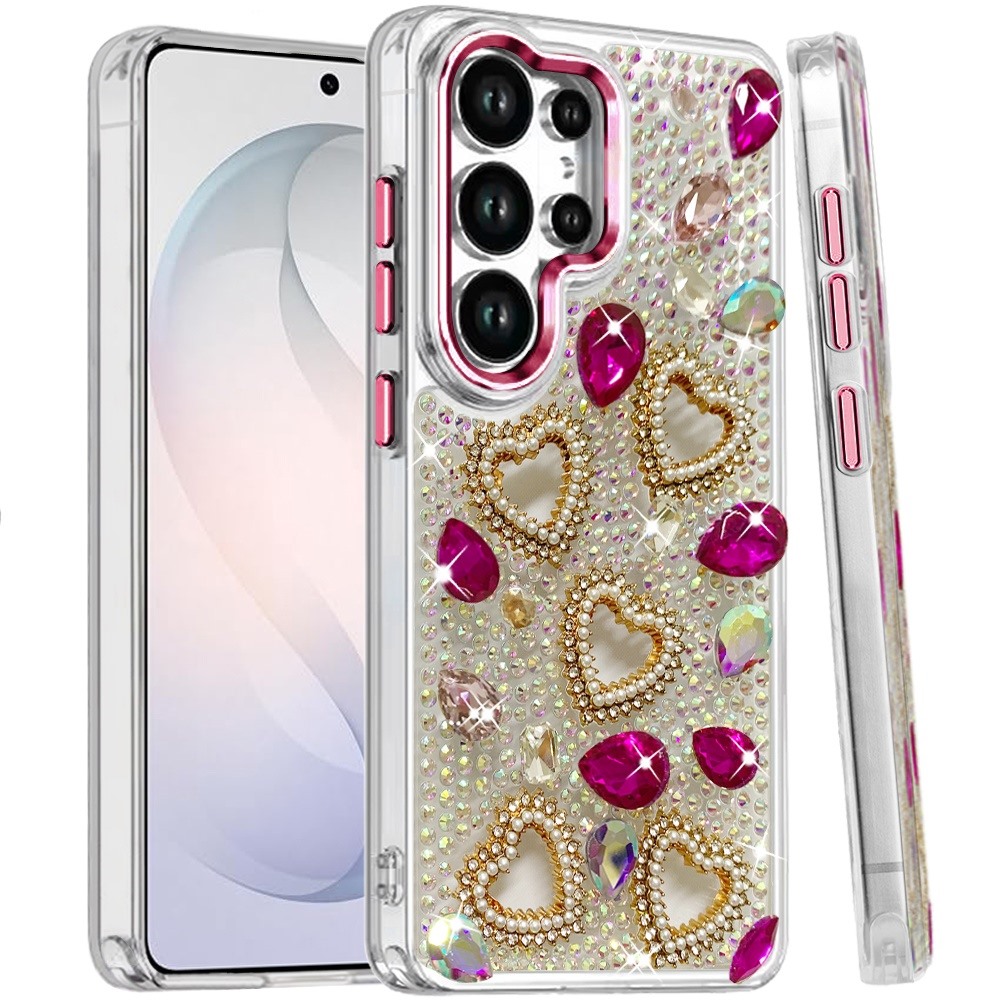 For Samsung s26 Ultra Luxury Crystal Heart Rhinestones Diamond Bling Hybrid Case - Hot Pink