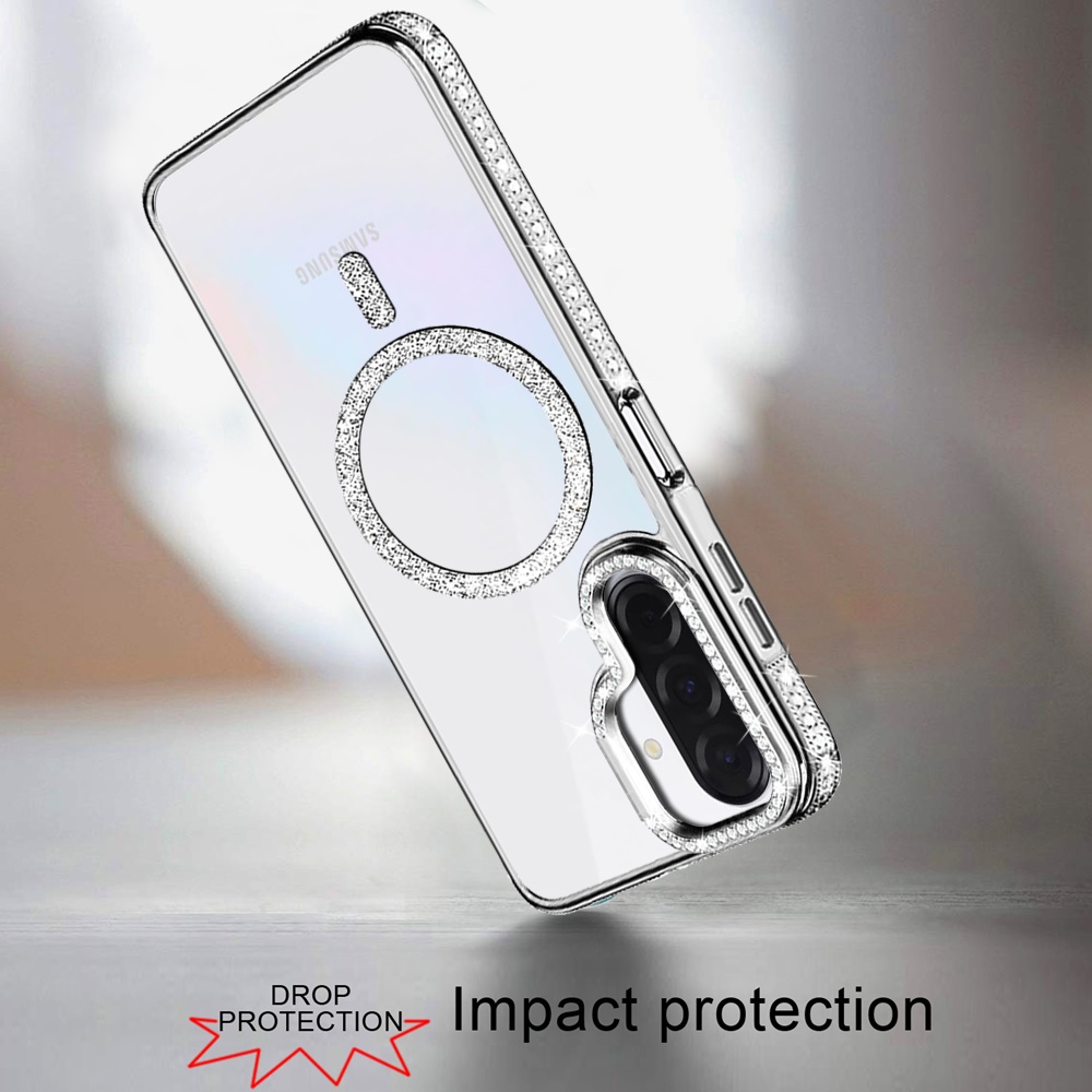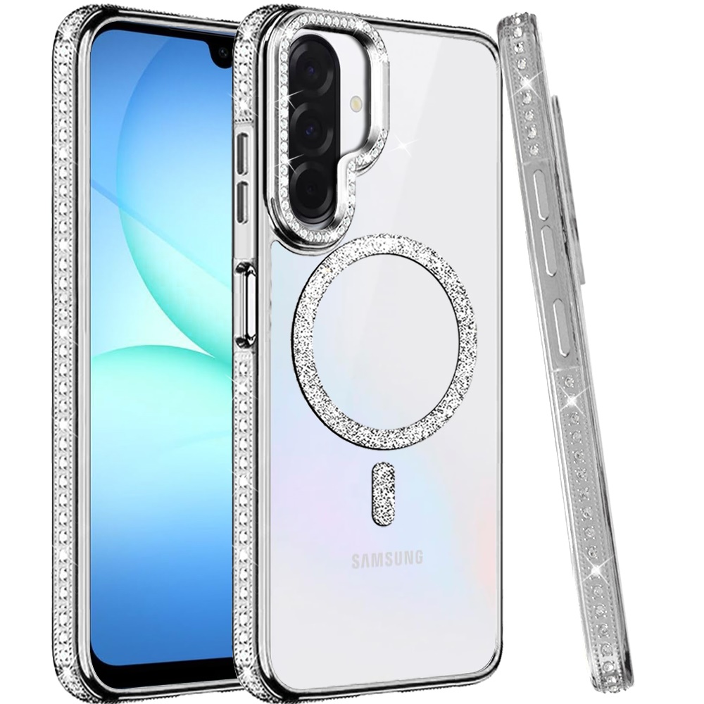 For Samsung A17 5G Luxury Diamond Edged Magnetic Glitter Circle Hybrid with Camera Stand - Silver