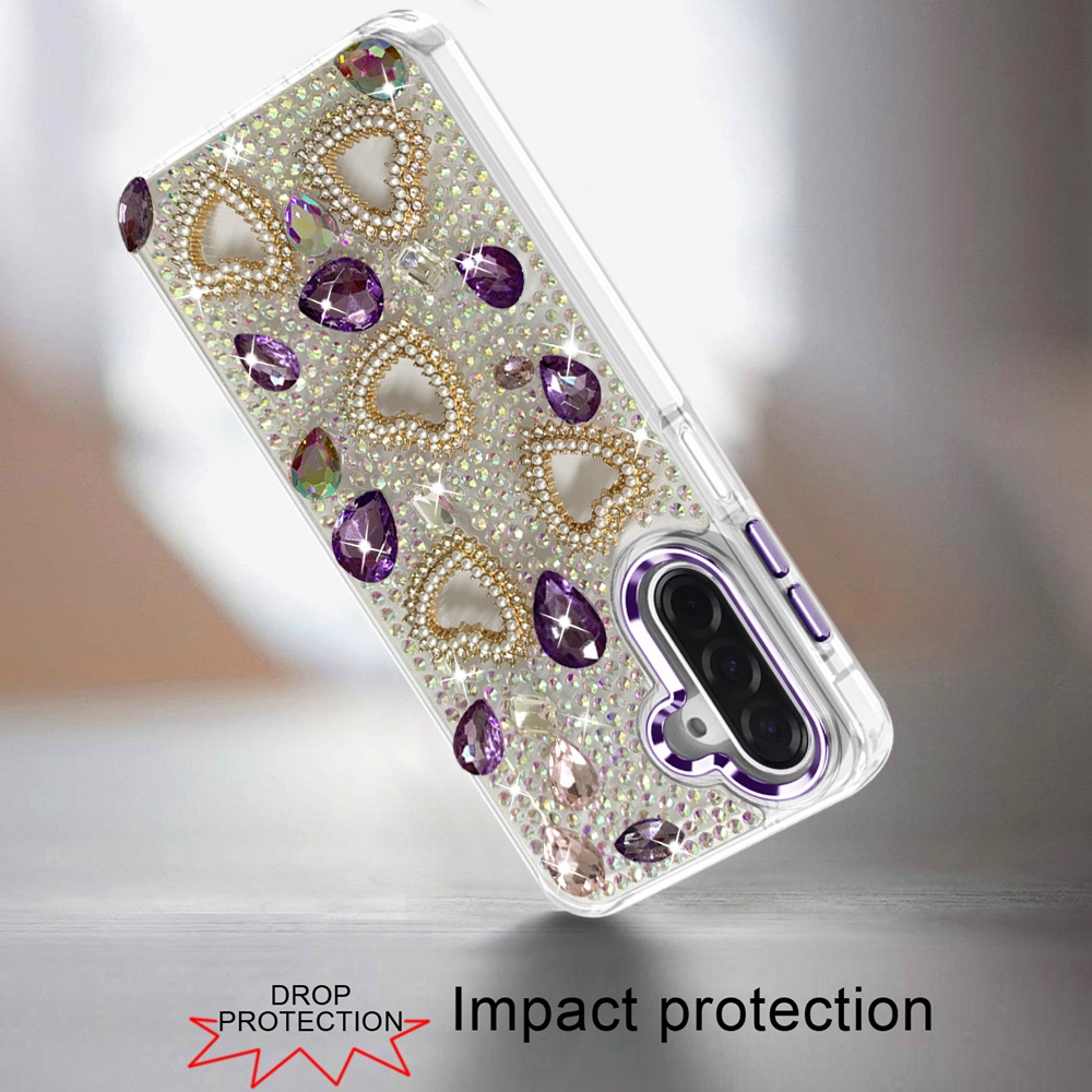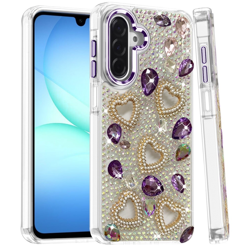 For Samsung A17 5G Luxury Crystal Heart Rhinestones Diamond Bling Hybrid Case - Dark Purple