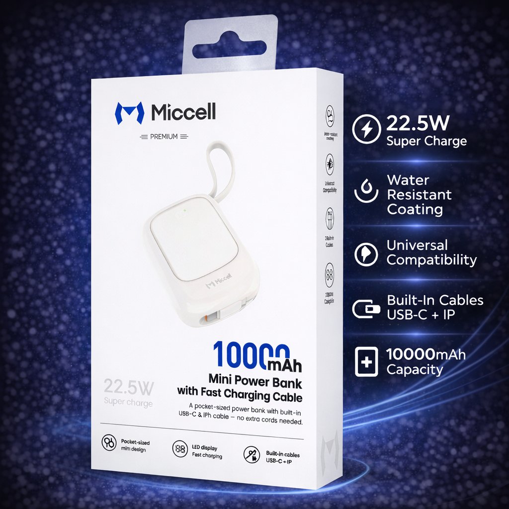 Miccell 10,000 mAh 22.5W Mini Powerbank with Built-In USB-C Cable - Beige