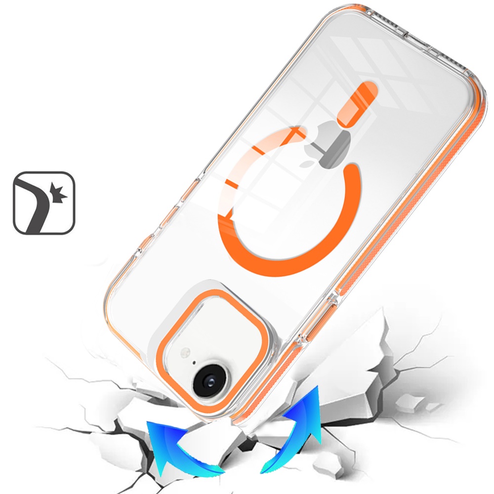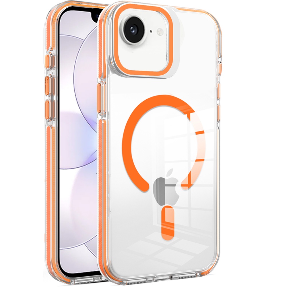 For iPhone 16E (E edition) / SE4 (2025) Camera Metallic Stand [Magnetic Circle] Transparent Colorful Matching Edged Tough Hybrid Case - Cosmic Orange