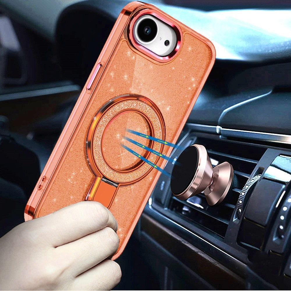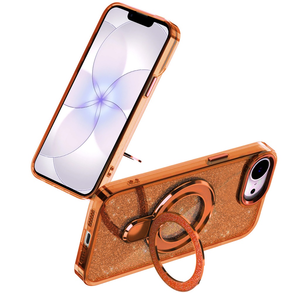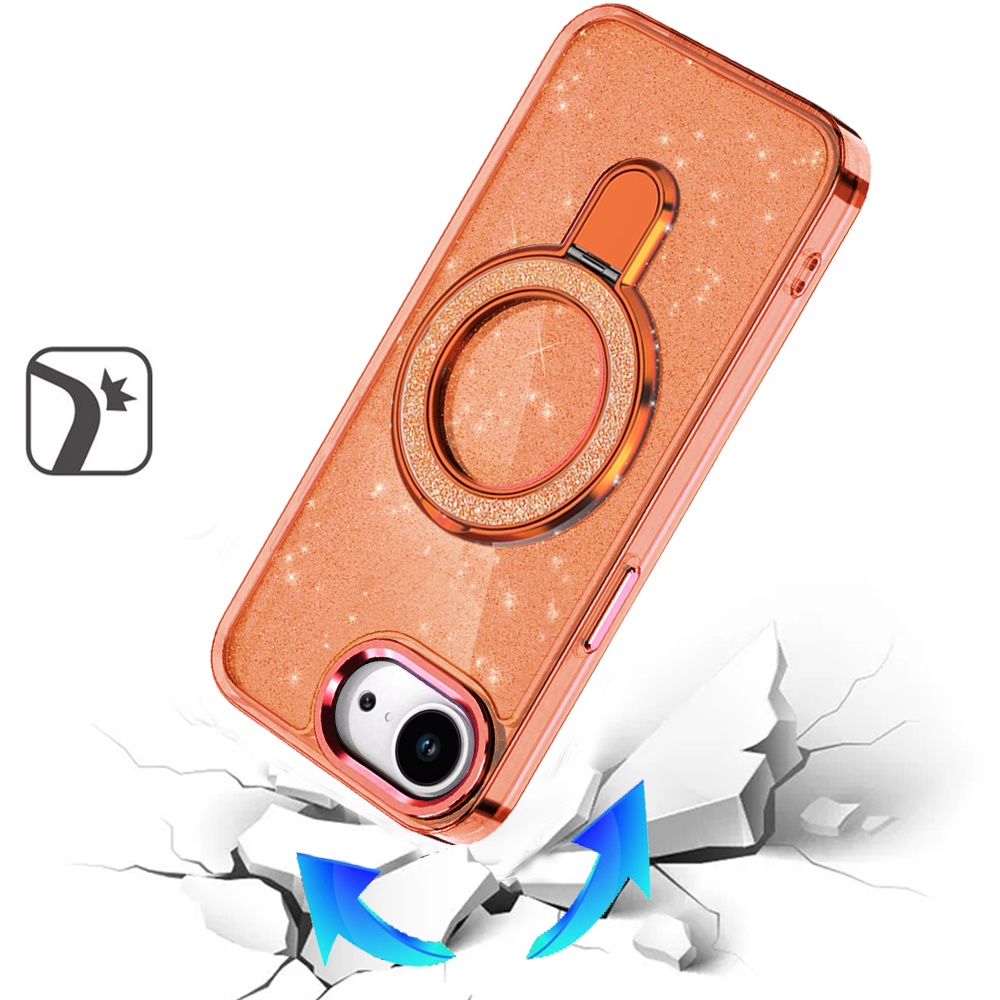 For iPhone 16E (E edition) / SE4 (2025) Transparent Glitter Rotaional Magnetic Ring Stand HQ Hybrid - Cosmic Orange