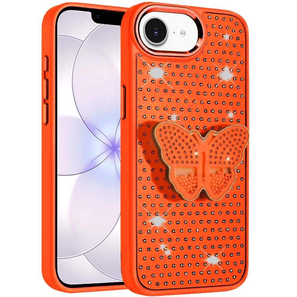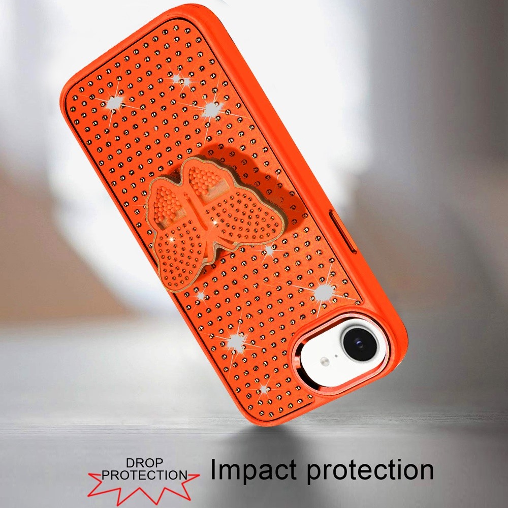For iPhone 16E (E edition) / SE4 (2025) Butterfly Moveable Grip Stand With Small Diamonds Meta Buttons HQ Hybrid - Cosmic Orange