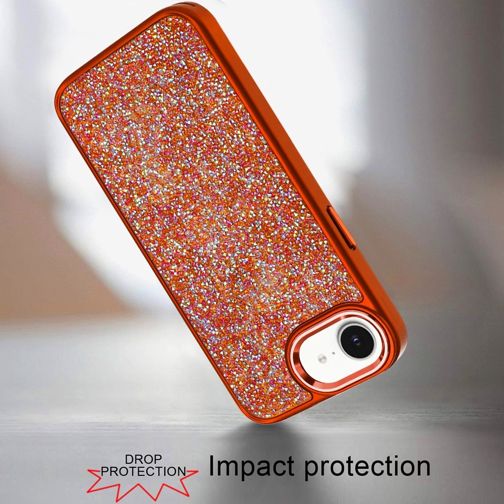 For iPhone 16E (E edition) / SE4 (2025) Crystal Glass Diamond with Metallic Buttons and Edges Hybrid Case - Cosmic Orange
