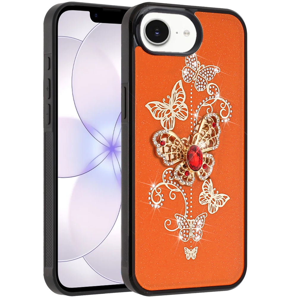 For iPhone 16E (E edition) / SE4 (2025) SPLENDID Diamond Glitter Ornaments Engraving Case Cover - Garden Butterflies Cosmic Orange