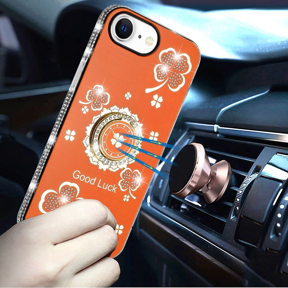 For iPhone 16E (E edition) / SE4 (2025) Splendid Glitter with Diamonds All Around Edges Ring Stand Case Cover - Cosmic Orange
