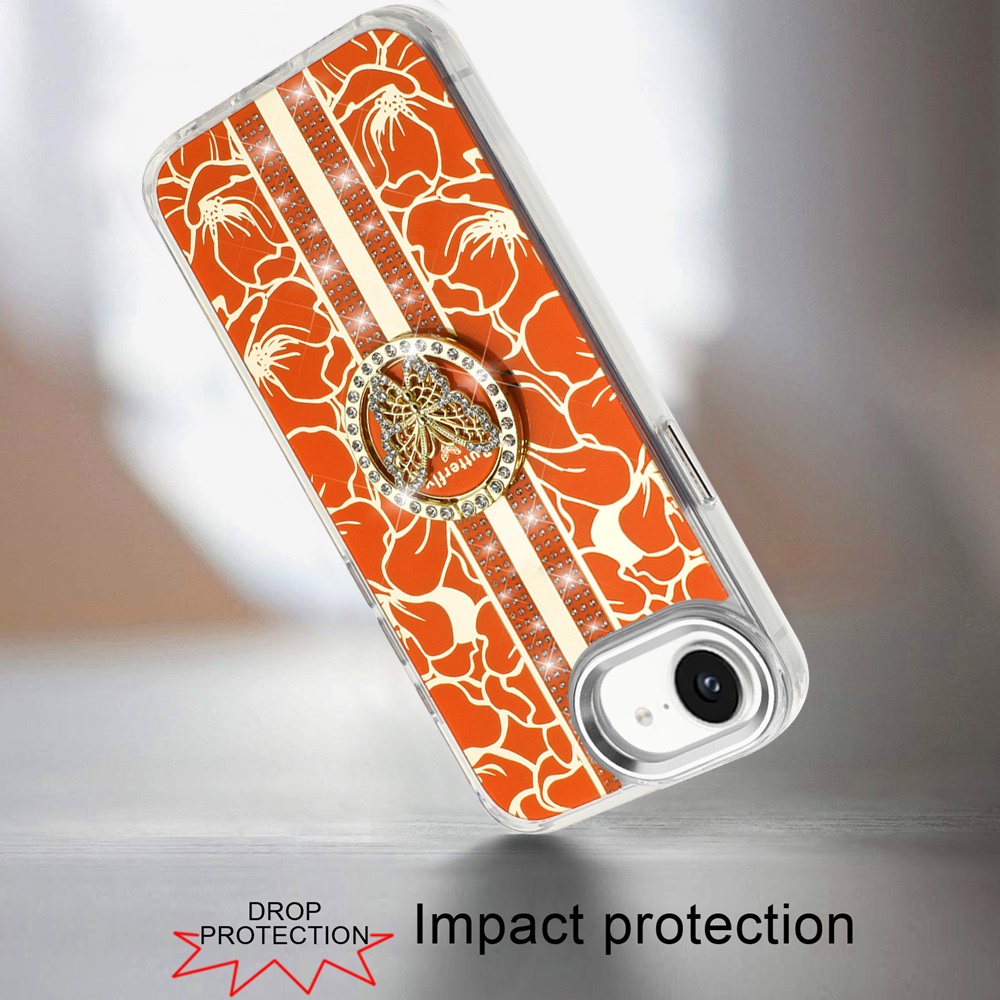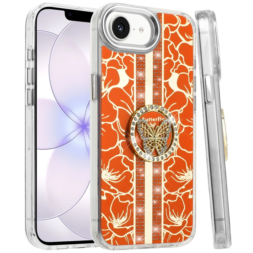 For iPhone 16E (E edition) / SE4 (2025) Splendid Floral Designs with Metal Camera and Buttons with Butterfly Ring Stand Hybrid Case - Cosmic Orange