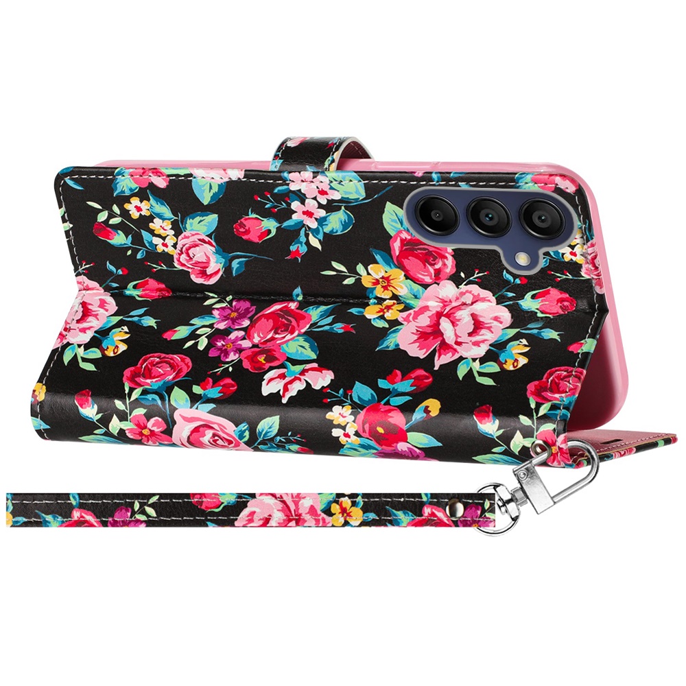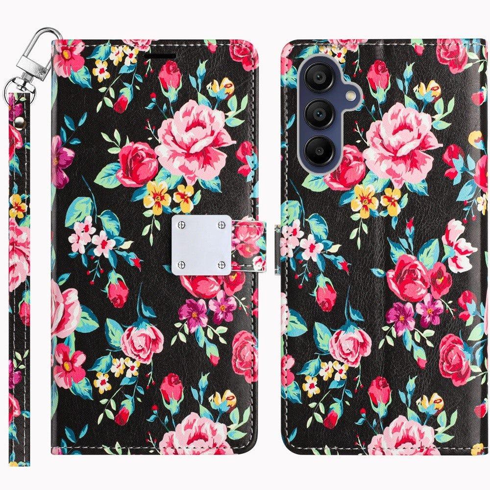 For Samsung A15 5G Design Wallet ID Credit Card Money Holder with Magnetic Metal Closure including Lanyard - Tropical Romantic Colorful Roses Floral
