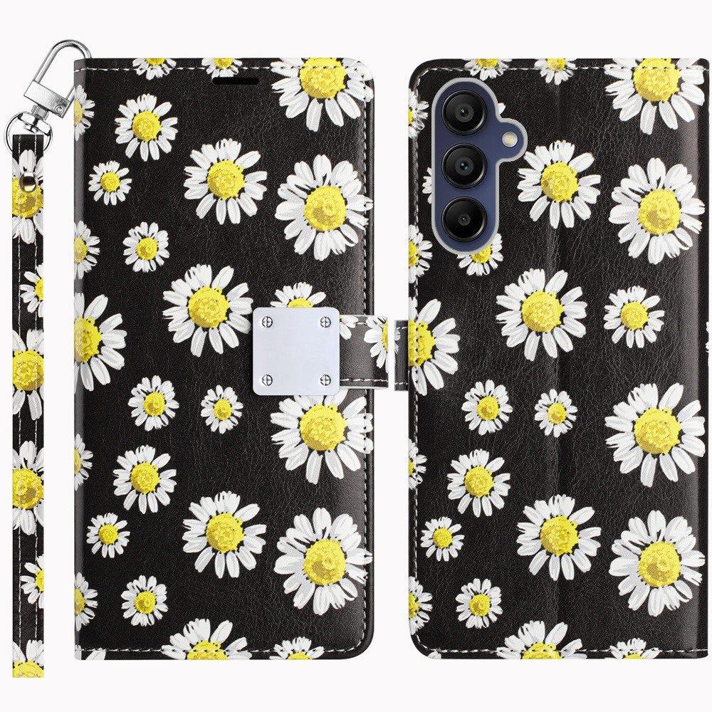 For Samsung A15 5G Design Wallet ID Credit Card Money Holder with Magnetic Metal Closure including Lanyard - White Daisy