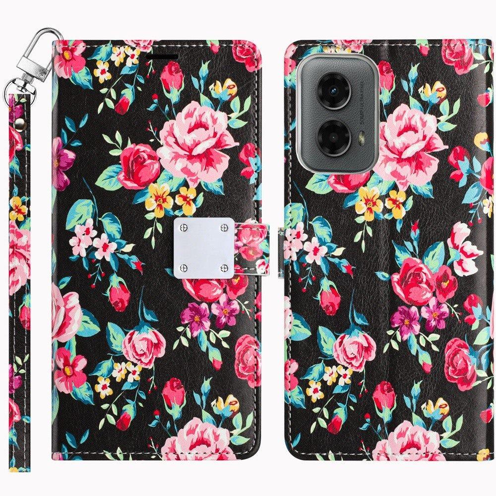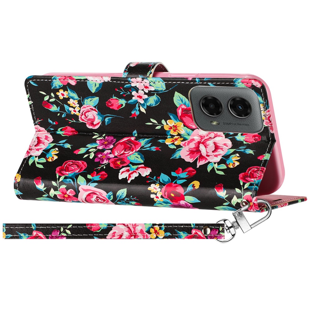 For Motorola Moto G 5G (2024) Design Wallet ID Credit Card Money Holder with Magnetic Metal Closure including Lanyard - Tropical Romantic Colorful Roses Floral